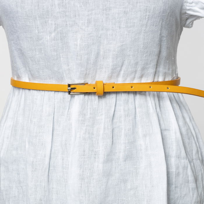 Curea subtire galbena de 0.9 cm, din piele ecologica cu catarama metalica argintie dreptunghiulara