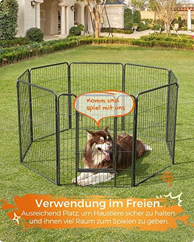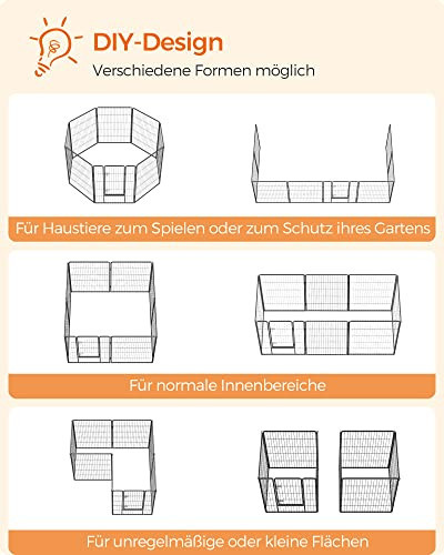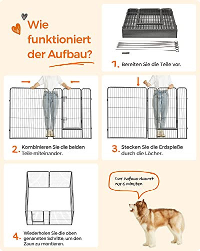 UN SPATIU PENTRU RAZBOI: O reuniune de familie in gradina nu inseamna ca trebuie sa va lasati cainele singur inauntru. Invitati-l sa se bucure de momentele fericite alaturi de toti cei din apropiere in tarcul de joaca pentru animale de companie cu 8 panouri cu dimensiuni de 77 x 100 cm fiecare. Daca se intampla sa aveti o mamica de caine acasa, aceasta incinta pentru caini functioneaza foarte bine si ca o cresa de interior PROTECTIE DUALA: Papucii dvs. vor fi salvati de muscatura catelului dvs. si nu vor mai avea urme de dinti ca urmare a zavorilor de usa in forma de L; chiar daca cainele dvs. este incredibil de inteligent, nu va putea deschide usa. Piesele metalice sunt echipate cu tampoane si capac de protectie a podelei, pentru a va proteja podeaua de zgarieturi Uite cum functioneaza: Introduceti tijele de legatura in articulatii pentru a construi un castel in forma patrata, dreptunghiulara, octogonala sau neregulata! Dati frau liber creativitatii si folositi la maxim casa sau curtea compacta a casei dvs. PRIETENII MICI SUNT BINEVENITI: Folositi tarcurile pentru animale de companie atat in interior, cat si in exterior pentru animalele de companie de talie mica, cum ar fi catelusii, iepurasii etc.; este un excelent teren de joaca si poate functiona, de asemenea, ca o partitie. NU SUNTETI INCA MULTUMIT? FEANDREA va ofera servicii profesionale pentru clienti atat inainte cat si dupa achizitie; nu mai asteptati, adaugati acest lucru la casa dvs. astazi.