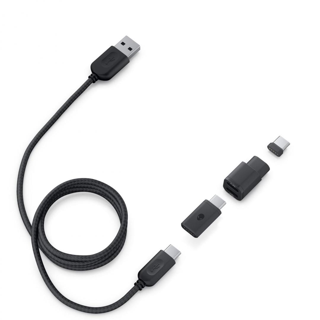 Dell Alienware Tri-Mode Wireless Gaming Mouse AW720M, Connection type: Tri-mode Wireless (2.4GHz, Bluetooth 5.1 and wired), Movement Resolution: 26000 dpi, , Magnetic Snap Charging Function, Adjustable Dots Per Inch (DPI), Wireless mode (2.4GHz), Buttons Qty: 8, Performance: 50 G maximum acceleration, 650 inches per second, Movement Detection Technology: Optical, Features: Auto-calibration, adjustable scrolling wheel, braided cable, ambidextrous design, 8 programmable buttons, magnetic snap, 5 on-the-fly DPI settings, detachable cable, 16.8 million AlienFX lighting, fast charging, 70 million clicks, , Battery: Technology: Lithium polymer, Run Time (Up To): 420 hour(s), DIMENSIONS & WEIGHT: Height: 3.78 cm, Width: 6.17 cm, Depth: 12.52 cm, Starting Weight: 89 grams, Available Colors: Dark Side of the Moon, Cable Length: 200 cm, What’s in the box: Mouse, USB charging cable, USB wireless dongle, USB-C magnetic dongle for charging, Dongle extender, Limited warranty - 2 years