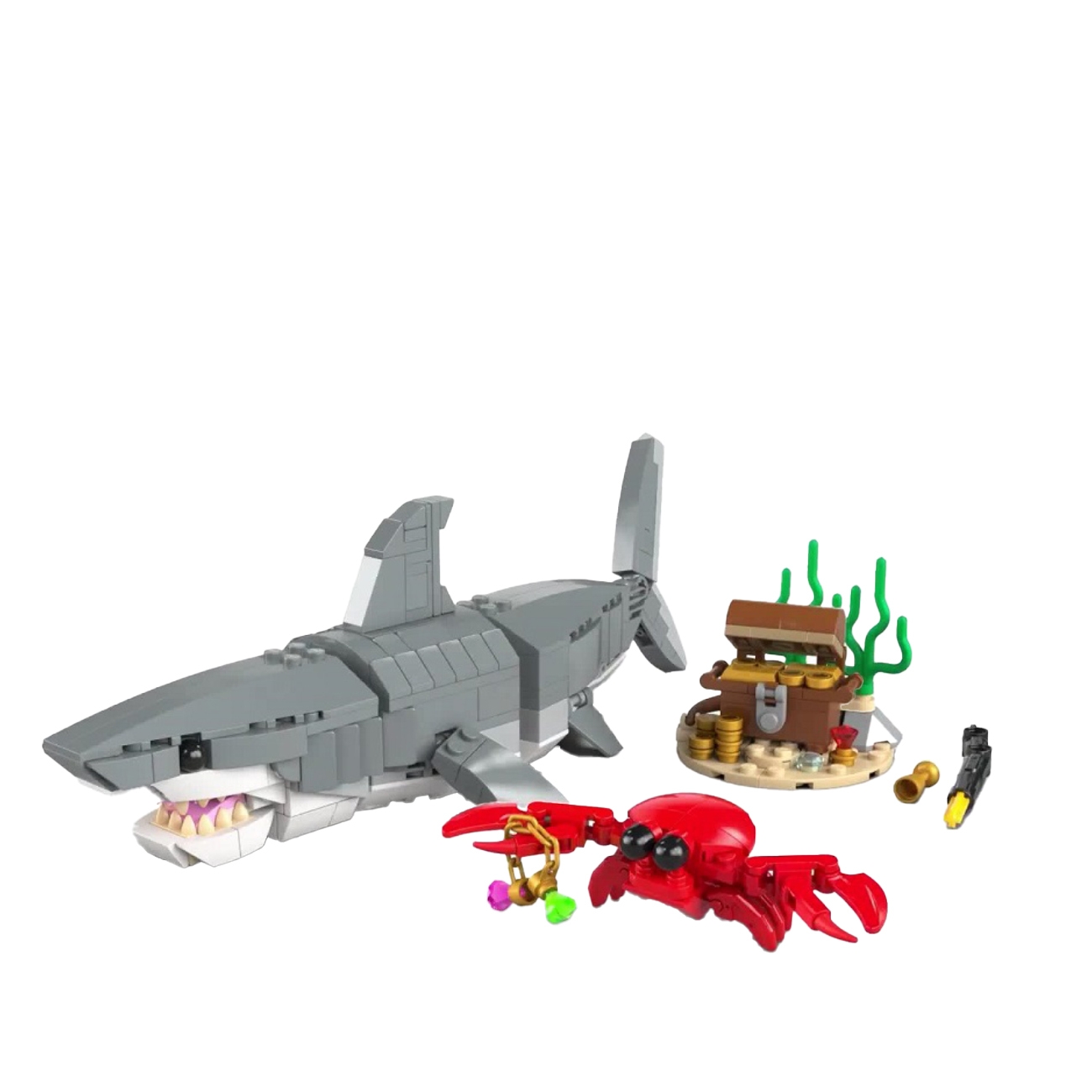 Setul LEGO Creator 3 în 1 – Fierce Shark with a Treasure Chest (cod 31381) îi invită pe micii constructori într-o aventură marină plină de imaginație și descoperiri. Cu 379 de piese, acest set oferă posibilitatea de a construi o impunătoare rechină cu fălci mobile, înotătoare reglabile și ochi expresivi, alături de un crab simpatic care păzește o ladă plină cu comori ascunse.