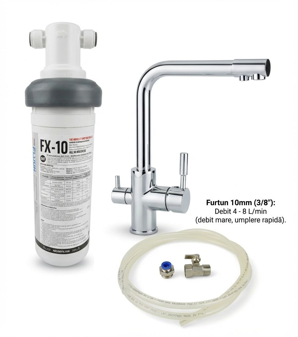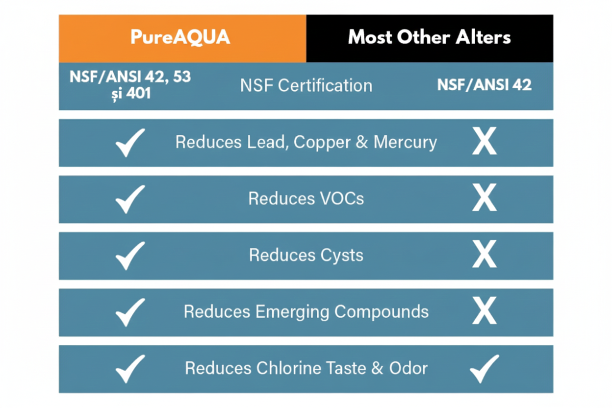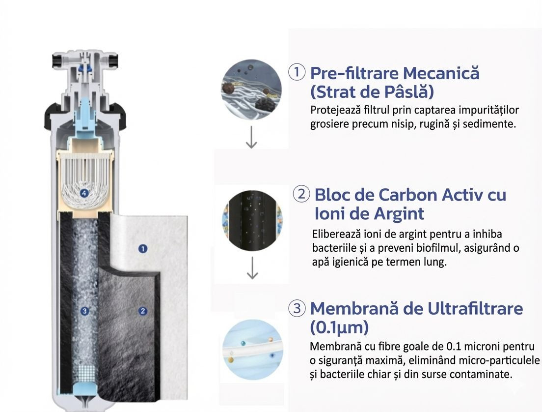 Sistem de Filtrare Avansată a Apei PureAqua Seria FX – Purificare în 3 Etape pentru o Apă Sigură și Curată Descoperă tehnologia de vârf în filtrarea apei cu sistemul PureAqua Seria FX. Proiectat pentru a oferi performanță maximă și igienă de lungă durată, acest filtru utilizează un proces complex în trei etape pentru a transforma apa de la robinet într-o sursă sigură de hidratare pentru întreaga familie. Durată de viață extrem de lungă: atunci când este utilizat cu apă urbană, are o durată de viață maximă de 1 an sau 30.000 de litri. Ușor de utilizat: filtrul de apă de sub chiuvetă oferă apă purificată de la robinetul original, se poate conecta si la frigider. Filtru certificată NSF 42 53 si 401 : Materialele premium selectate , fiind complet certificate. Blocul de cărbune activ și alte medii filtrante extinse asigură o filtrare eficientă și sigură. Respectă standardele NSF 42, este eficientă în reducerea clorului, a gustului și a mirosului. Utilizează o filtrare inovatoare în mai multe etape. Și poate reduce eficient metalele grele, poluanții chimici, sedimentele și alte particule mari. Bucurați-vă de apă sănătoasă și pură direct de la robinet - nu mai trebuie să cumpărați si sa carati apă imbuteliata ! Instalare rapidă: designul cu răsucire și blocare al filtrului inferior al chiuvetei asigură înlocuirea acestuia în 3 secunde fără unelte și economisește timp și efort. Iată cum funcționează tehnologia inovatoare din interiorul cartușului FX-Series: Cele 3 Etape ale Purificării Complete: 1. Pre-filtrare Mecanică (Stratul de Pâslă/Felt) Aceasta este prima linie de apărare a sistemului. Stratul dens de pre-filtrare acționează ca o barieră fizică eficientă. Beneficiu principal: Protejează și prelungește durata de viață a filtrului prin captarea impurităților grosiere. Ce elimină: Reține particulele solide în suspensie, cum ar fi nisipul, sedimentele, reziduurile de rugină de pe conducte și alți contaminanți vizibili. 2. Bloc de Carbon Activ tratat cu Ioni de Argint (Flux Silver Ion) Inovația centrală a acestui filtru constă în blocul de carbon activ îmbogățit. Prin eliberarea controlată a ionilor de argint de pe suprafața filtrului, acesta oferă o protecție activă, nu doar pasivă. Beneficiu principal (Igienă Superioară): Asigură un management igienic al calității apei pe termen lung. Tehnologia cu ioni de argint inhibă în mod activ dezvoltarea bacteriilor și previne formarea biofilmului în interiorul cartușului, chiar și în perioadele de neutilizare. Ce face: Îmbunătățește gustul și mirosul apei, menținând în același timp un mediu steril în interiorul filtrului. 3. Membrană de Ultrafiltrare (UF-Membrane) Etapa finală de polisare asigură siguranța absolută a apei. Filtrul încorporează o membrană avansată cu fibre goale (hollow fiber) și o finețe de filtrare excepțională de 0.1 microni (0.1μm). Beneficiu principal (Siguranță Maximă): Oferă o calitate sigură a apei potabile chiar și în medii unde sursa de apă ar putea fi contaminată. Ce elimină: Porii extrem de fini blochează trecerea micro-particulelor și a majorității bacteriilor și microorganismelor, lăsând să treacă doar apa curată și mineralele esențiale. Alege FLUUX Seria FX pentru liniștea ta sufletească. Bucură-te de o apă cristalină, sigură și cu un gust proaspăt, direct la tine acasă! Filtrele Pure Aqua sunt certificate NSF/ANSI 42, 53, 401, iata ce ce tipuri de contaminanți pot elimina și nivelul de protecție oferit. Pe scurt: ? 42 = gust & miros ? 53 = contaminanți periculoși pentru sănătate ? 401 = poluanți emergenți (medicamente, pesticide moderne) NSF/ANSI 42 – filtrare „estetică” Este nivelul de bază. Ce face: ✔️ reduce clorul ✔️ îmbunătățește gustul și mirosul ✔️ reduce particulele grosiere (nisip, rugină) Ce NU face: ❌ nu elimină metale grele ❌ nu elimină substanțe toxice ❌ nu elimină medicamente, pesticide, bacterii ? Filtrele doar NSF 42 sunt bune dacă: apa este potabilă conform legii vrei doar gust mai bun (ex: apă de oraș clorinată) NSF/ANSI 53 – protecție pentru sănătate Este un salt major față de 42. Poate reduce (în funcție de model): ✔️ plumb ✔️ mercur ✔️ crom ✔️ arsenic ✔️ nitrați ✔️ azbest ✔️ chisturi (Giardia, Cryptosporidium) ✔️ VOC-uri (solvenți industriali) ? Certificarea 53 înseamnă: filtrul a fost testat pentru siguranță reală, nu doar gust este recomandat pentru zone cu rețele vechi sau risc chimic NSF/ANSI 401 – poluanți emergenți Este cea mai modernă certificare. Elimină substanțe care: nu erau reglementate când s-a creat NSF 53 apar din activitatea umană modernă Exemple: ✔️ medicamente (ibuprofen, antibiotice, hormoni) ✔️ pesticide moderne ✔️ erbicide ✔️ substanțe PFAS (parțial, în funcție de filtru) ✔️ detergenți și compuși industriali noi ? NSF 401 = protecție pe termen lung, „viitor-proof” Certificare Ce elimină Nivel NSF 42 Clor, gust, miros, particule Basic NSF 42 + 53 + metale grele, toxine, chisturi Avansat NSF 42 + 53 + 401 + medicamente, pesticide moderne Premium
