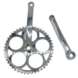 Foi Bicicletă Engros (Angrenaj), Prindere pe Pătrat, Mărime Rusă/Clasic, 46 Dinți – Componentă Fiabilă pentru Transmisii Single-Speed! Acest set de foi (angrenaj) pentru bicicletă, disponibil en-gros, este o componentă de bază esențială pentru sistemele de transmisie cu o singură viteză, fiind ideal pentru bicicletele clasice, de tip rusesc sau românesc, single-speed sau de oraș. Fabricat din metal cu un finisaj cromat lucios și cu 46 de dinți, acest angrenaj este perfect pentru a fi oferit service-urilor de biciclete, magazinelor de specialitate și distribuitorilor care caută soluții durabile și cu estetică clasică pentru reparații și asamblări de biciclete. Detalii Produs: Tip Angrenaj: O Singură Viteză (Single Speed): Conceput specific pentru bicicletele cu o singură viteză, asigurând o compatibilitate perfectă și o funcționare optimă fără a necesita deraioare sau sisteme complexe.Prindere pe Pătrat (Square Taper): Brațul angrenajului (manivela) și butucul monobloc (nu este inclus, dar vizibil orificiul de prindere) utilizează sistemul clasic de prindere pe pătrat, un standard robust și larg răspândit, mai ales la bicicletele mai vechi sau cele de oraș.Număr de Dinți (46 T): Foaia mare are 46 de dinți, o dimensiune comună pentru bicicletele de oraș sau cele clasice, oferind un echilibru bun între viteză și ușurința de pedalare.Material Metalic Cromat: Angrenajul este fabricat integral din metal (probabil oțel), cu un finisaj cromat lucios (argintiu), conferindu-i durabilitate, rezistență la coroziune și un aspect estetic clasic.Estetică Retro/Clasică: Designul robust, cu orificii circulare pe foaie și aspectul cromat, îl face potrivit pentru bicicletele cu stil retro sau cele clasice.Set Complet (Foaie și Braț Manivelă): Setul include foaia cu brațul manivelă fix și un braț manivelă separat, completând un angrenaj.