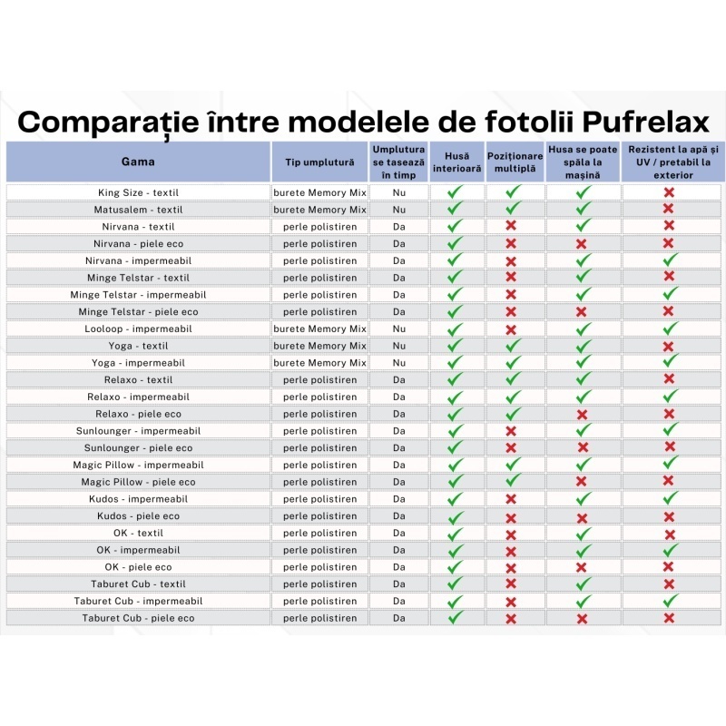 Fotoliu puf Nirvana Grande Flower Buds Fotoliu puf confortabil și spațios, potrivit pentru relaxare, citit sau serile în fața televizorului. Varianta Flower Buds este ideală pentru utilizarea de zi cu zi, iar materialul textil îi oferă un aspect plăcut și confortabil. De ce să alegi acest model? Dimensiune mare – confortabil pentru adulți și adolescenți ~320 litri perle de polistiren – se mulează pe corp și oferă susținere confortabilă Doar ~4 kg – ușor de mutat dintr-o cameră în alta Material textil, plăcut la atingere – oferă un plus de confort și un aspect prietenos Fabricat în România – produs Pufrelax Specificații Dimensiuni: 100 × 100 × 80 cm Umplutură: ~320 litri perle de polistiren Greutate: ~4 kg Material husă: textil Culoare: Flower Buds Utilizare: interior Unde se potrivește Fotoliul Nirvana Grande Flower Buds este potrivit pentru living, zona de relaxare sau colțul de citit. Dimensiunea sa generoasă îl face ideal pentru zonele în care ai nevoie de un loc confortabil de relaxare. Nirvana Grande este o alegere practică pentru cei care își doresc un fotoliu puf confortabil, spațios și simplu de integrat în rutina de zi cu zi.