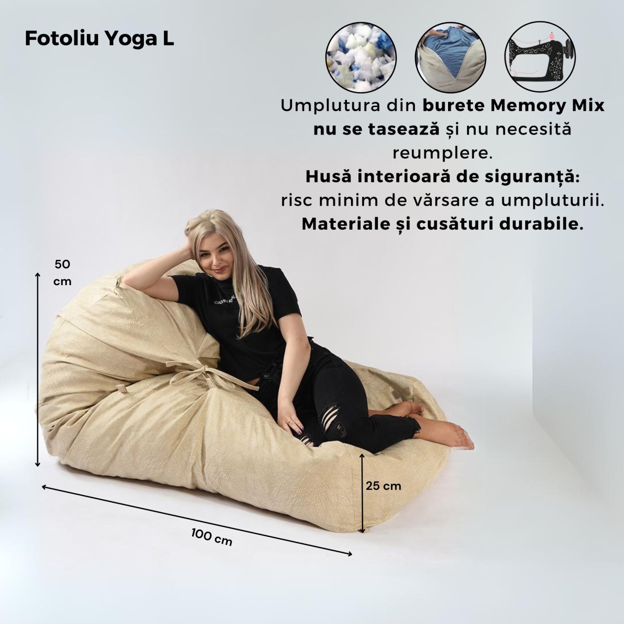 Fotoliu Yoga L – fotoliu puf flexibil pe burete memory mix Fotoliul Yoga L – Pufrelax este varianta medie din gama Yoga. Flexibil și versatil, poate fi folosit ca fotoliu, șezlong, pat de o persoană sau ca un spătar confortabil. Structura pe burete memory mix oferă susținere fermă și confort constant. De ce să alegi acest model? Flexibil și versatil – se folosește ca fotoliu, șezlong sau pat Dimensiuni medii – 100 × 60 × 50 cm, echilibru între confort și portabilitate Structură pe burete memory mix – susținere fermă, stabilă, își păstrează forma în timp Husă detașabilă și lavabilă – se spală la mașina de spălat la 30°C Nu necesită completare – buretele își păstrează proprietățile Fabricat în România – produs Pufrelax, materiale premium și cusături durabile Specificații Dimensiuni: aproximativ 100 × 60 × 50 cm Dimensiuni extinse: aproximativ 180 × 60 × 25 cm Umplutură: fulgi de burete memory mix Material husă: textil, detașabilă și lavabilă Utilizare: interior Unde se potrivește Yoga L este potrivit pentru living, dormitor sau camera de relaxare. Se adaptează la mai multe poziții – ideal pentru citit, vizionat filme sau odihnă. Yoga L este fotoliul flexibil din gama Yoga Pufrelax, fabricat în România. Burete memory mix, husă lavabilă și format versatil – confort pentru orice poziție.