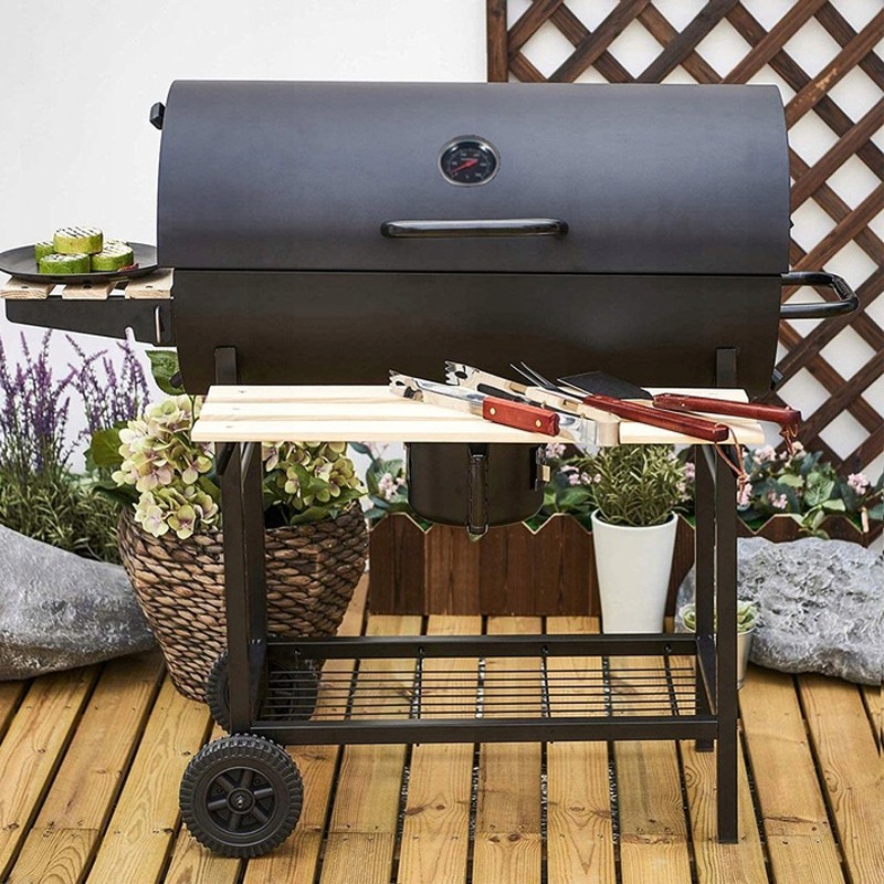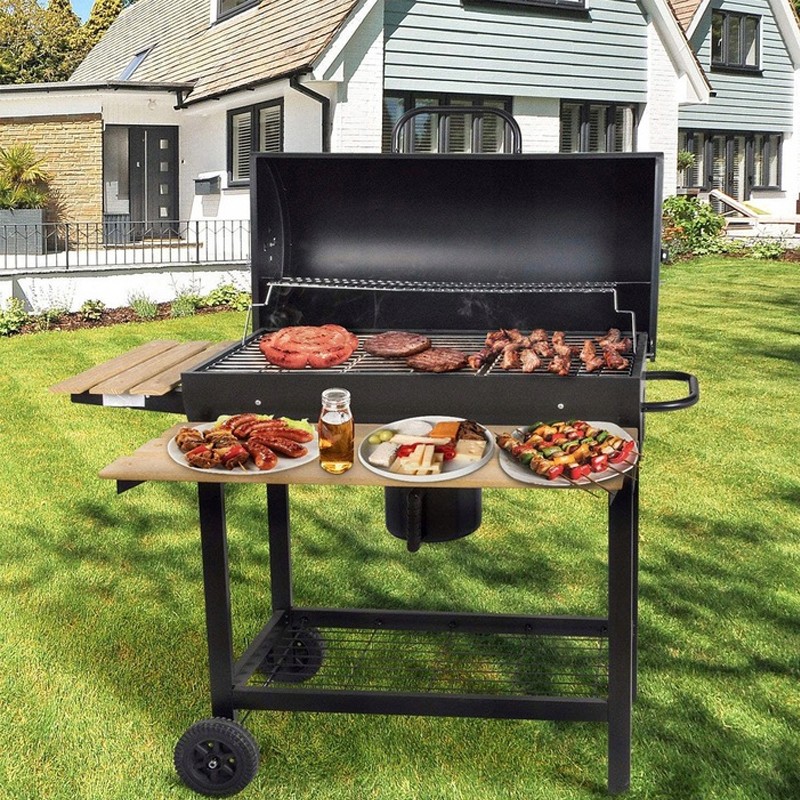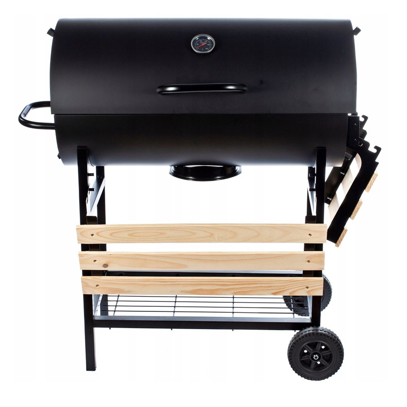 Gratar carbune BBQ, 2 rafturi lemn, colector cenusa, termometru incorporat, sort inclus Acesta este alegerea perfecta pentru iubitorii de gratar fiind ideal pentru petreceri in gradina, picnit, pescuit sau pentru diferite sarbatori in familie. Baza gratarului si hota sunt realizate din otel inoxidabil si este acoperit cu o vopsea mata rezistenta la caldura. Gratarul este prevazut cu un termometru incorporat, 2 rafturi din lemn si roti din otel. Orificiile de ventilatie regleaza fluxul de aer astfel incat carbunele sa nu arda prea repede iar orificiile de aerisire de la colectorul de cenusa asigura o buna circulatie a aerului. Gratarul este prevazut cu 2 rafturi din lemn separate care se pliaza usor si pe care puteti pune diferite vase sau ustensile. Gratarul este usor de montat si de transportat datorita rotilor mobile iar indepartarea cenusii este simpla datorita colectorului de cenusa. Dimensiunile gratarului sunt 75.5 x 39 x 95 cm. Specificatii: - gratar carbune; - sort inclus; - grill cromat; - capac cu maner; - termometru incorporat; - 2 suporturi din lemn; - roti mobile; - usor de montat si de transportat; - acoperit cu vopsea mata rezistenta la caldura; - orificii de ventilatie pentru reglarea fluxului de aer; - orificii de aerisire pentru circulatia aerului; - tava pentru cenusa; - dimensiune gratar 75.5 x 39 x 95 cm; - dimensiune pachet 78 x 43 x 26cm; - material otel/lemn; - culoare negru.