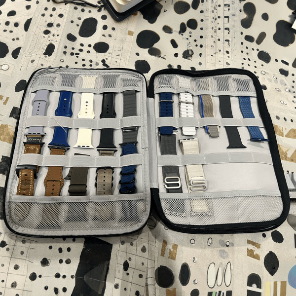 Te-ai saturat sa te chinui sa îti organizezi curelele smartwatch-ului? Te trezesti scotocind prin sertare, în cautarea curelei perfecte care sa se potriveasca cu tinuta ta? Noi avem solutia pe care o cauti! Îti prezentam husa din material textil care ajuta la depozitarea a 35 curele de ceasuri, compatibila cu Apple Watch, Huawei Watch, Galaxy Watch sau orice fel de curea, într-o culoare neagra atemporala. Imagineaza-ti ca ai toate curelele smartwatch-ului tau organizate frumos într-un singur loc, usor de accesat oricând ai nevoie de ele. Husa nu numai ca ofera o solutie de depozitare eleganta, dar raspunde si unei nevoi comune împartasite de pasionatii de smartwatch-uri ca tine. Gata cu curelele încurcate sau ratacite - aceasta husa le va pastra în siguranta si mereu gata sa îti completeze stilul. Confectionata cu grija si precizie, husa este proiectata pentru a îndeplini cele mai înalte standarde de calitate si durabilitate. Materialul din nylon ofera o senzatie placuta la atingere, asigurându-se ca pretioasele tale curele sunt protejate de praf, zgârieturi si uzura zilnica. Va recomandam sa luati în considerare ca produsul poate avea o culoare usor diferita decât cea afisata din cauza diferentelor de calibrare ale ecranelor. Specificatii tehnice: Tip produs: Husa organizatoare pentru curele Material: Nylon Culoare: Negru Locuri disponibile: 35 Dimensiune: 225 x 305 mm Continut pachet: 1 x Husa organizatoare (Curelele nu sunt incluse)