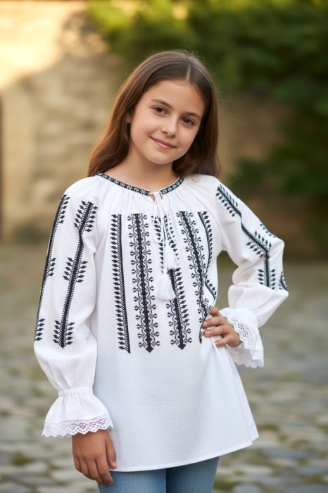 Ie din panza de bumbac 100%, Broderie cusuta la masina. Culoare: alb, crem si negru Marimi disponibile: S -100cm circumferinta bustului, 65 cm lungime, M -105cm circumferinta bustului, 65 cm lungime, L , 110cm circumferinta bustului, 66 cm lungime,...