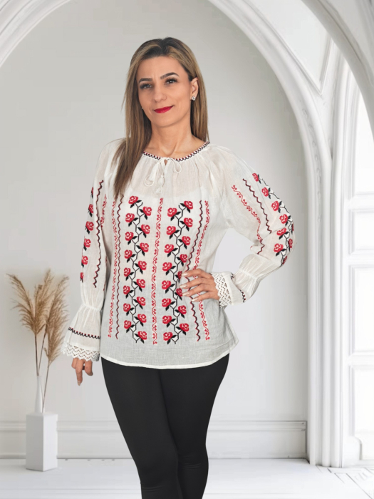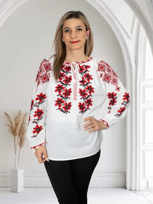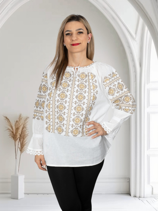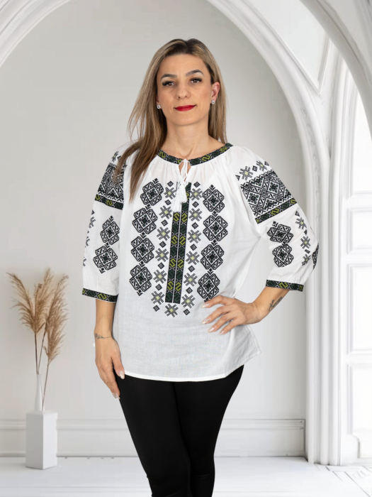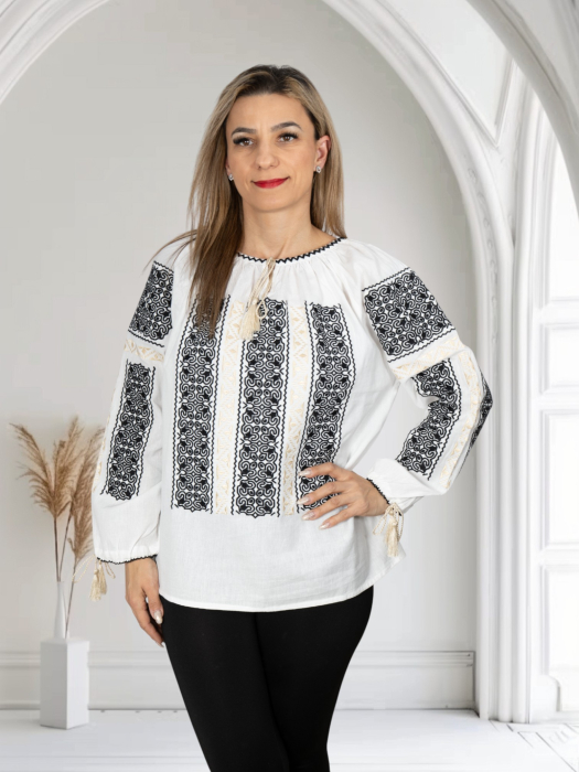 Ie din panza de bumbac 100%, Broderie cusuta la masina. Culoare: alb cu broderie neagra si albastra Marimi disponibile: S -100cm circumferinta bustului, 65 cm lungime, M -105cm circumferinta bustului, 65 cm lungime, L , 110cm circumferinta bustului,...