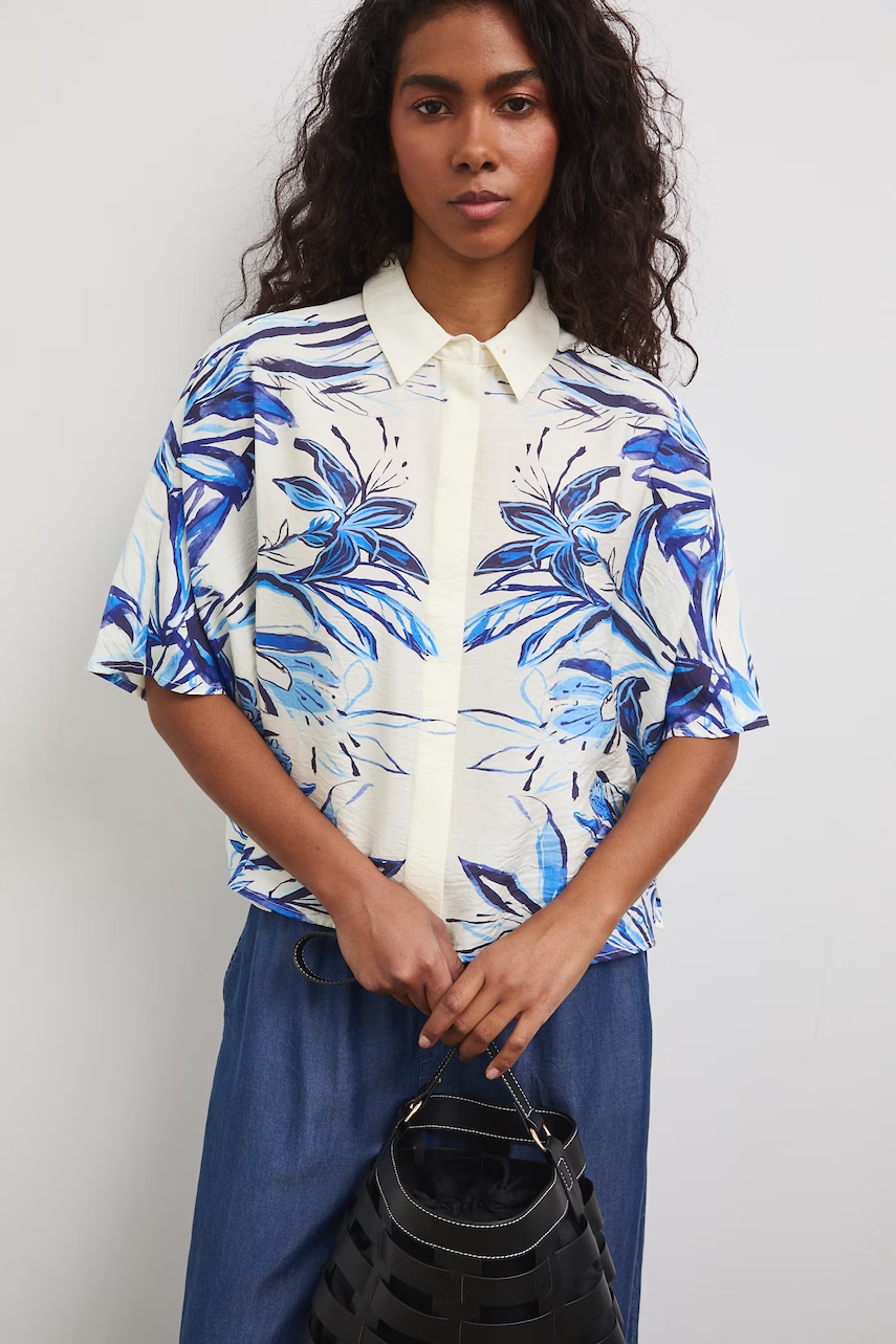 - Croială lejeră pentru libertate totală de mișcare. - Decolteu rotund, în coaste. - Croiala la mânecă cu o linie coborâtă a umerilor nu limitează mobilitatea. - Model de inalta calitate fabricat in Italia. - Model cu imprimeu.