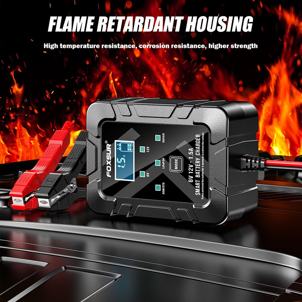 _x000D_Incarcator Automat pentru Baterii - FOXSUR 6V/12V 1.5A_x000D_FOXSUR 6V/12V este un incarcator inteligent, conceput pentru a oferi o solutie eficienta si sigura de incarcare si intretinere a bateriilor auto si moto. Datorita tehnologiei avansate cu 7 etape si functiei Pulse Repair, acest dispozitiv este ideal pentru prelungirea duratei de viata a bateriilor plumb-acid (AGM, GEL, SLA, WET) si LiFePO4._x000D__x000D_Functii principale:_x000D_✔️ Incarcare inteligenta cu 7 etape – Detectare automata a tipului de baterie si ajustare a procesului de incarcare.✔️ Mod Pulse Repair – Restaurare si intretinere pentru bateriile descarcate sau sulfatate.✔️ Afisaj LCD digital – Informatii clare despre voltaj, nivel de incarcare si starea bateriei.✔️ Protectie multipla inteligenta – Protectie la supratensiune, supraicncarcare, supraincalzire, scurtcircuit si conexiune inversa.✔️ Compatibilitate extinsa – Poate fi utilizat pentru motociclete, masini, ATV-uri, barci si alte echipamente cu baterii de 6V sau 12V.✔️ Compatibil cu baterii LiFePO4 si plumb-acid – AGM, GEL, SLA, EFB, WET, deep-cycle si VRLA.✔️ Mod de intretinere – Incarcare de intretinere pentru a mentine bateria in stare optima pe termen lung.✔️ Compatibil cu prize UE si SUA – Se livreaza cu optiuni pentru ambele standarde de priza._x000D__x000D_Specificatii tehnice:_x000D__x000D_Tip baterii compatibile: 6V si 12V (AGM, GEL, SLA, WET, LiFePO4)_x000D_Capacitate baterii: 4Ah - 30Ah_x000D_Putere de intrare: 100-240V AC, 50/60Hz_x000D_Tensiune de iesire: 6V / 12V_x000D_Curent maxim de incarcare: 1.5A_x000D_Dimensiuni: 120mm x 85mm x 55mm_x000D_Greutate neta: 312g_x000D_Lungime cablu iesire: Aproximativ 180 cm_x000D_Temperatura de operare: -20°C ~ +45°C_x000D_Moduri de incarcare:_x000D__x000D_6V / 12V – Selectare manuala a tensiunii_x000D_AGM/STD – Pentru baterii AGM, GEL, SLA, WET, deep-cycle, EFB_x000D_LiFePO4 – Pentru baterii cu litiu fosfat de fier (LiFePO4)_x000D_Repair Mode – Mod de reparare si regenerare pentru bateriile sulfatate_x000D__x000D__x000D__x000D__x000D_Cum se utilizeaza?_x000D__x000D_Conectare: Introduceti incarcatorul in priza._x000D_Atasare clesti: Conectati clestele rosu la borna pozitiva (+) si clestele negru la borna negativa (-) a bateriei._x000D_Selectare mod: Apasati butonul „Mode” pentru a alege intre 6V, 12V, AGM/STD, LiFePO4 sau Repair Mode._x000D_Incepe incarcarea: Incarcatorul va detecta automat starea bateriei si va aplica modul optim de incarcare._x000D_Monitorizare pe LCD: Urmariti nivelul de incarcare si tensiunea afisata pe ecran._x000D_Incarcare completa: Dispozitivul va comuta automat pe modul de intretinere dupa incarcarea completa._x000D__x000D__x000D_Continut pachet:_x000D_✅ Incarcator inteligent FOXSUR 6V/12V 1.5A✅ Set de clesti crocodil pentru conectare la baterie✅ Manual de utilizare_x000D__x000D_De ce sa alegi FOXSUR 6V/12V?_x000D_? Tehnologie avansata – Incarcare automata cu 7 etape pentru protectia bateriei.? Reparare inteligenta – Mod Pulse Repair pentru a reface bateriile slabite sau sulfatate.? Siguranta maxima – Protectie la scurtcircuit, supraincalzire si inversare polaritate.? Afisaj LCD intuitiv – Ofera informatii clare despre progresul incarcarii.? Versatilitate extinsa – Potrivit pentru baterii auto, moto, ATV, barci si alte vehicule electrice._x000D__x000D_Cumpara acum si asigura-te ca bateria ta este mereu in stare optima!_x000D__x000D__x000D__x000D_