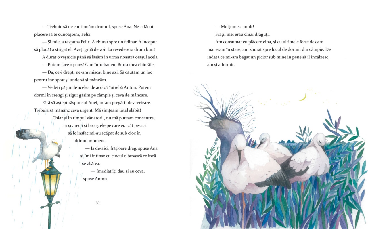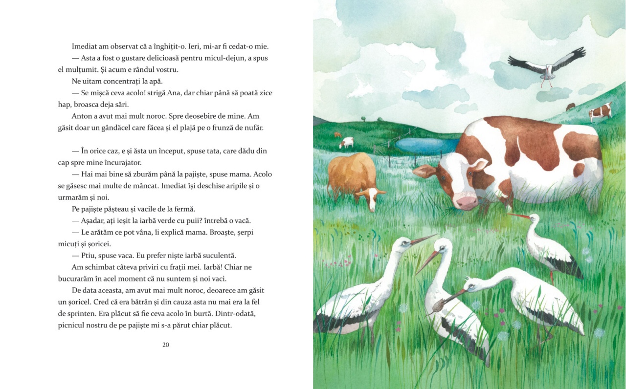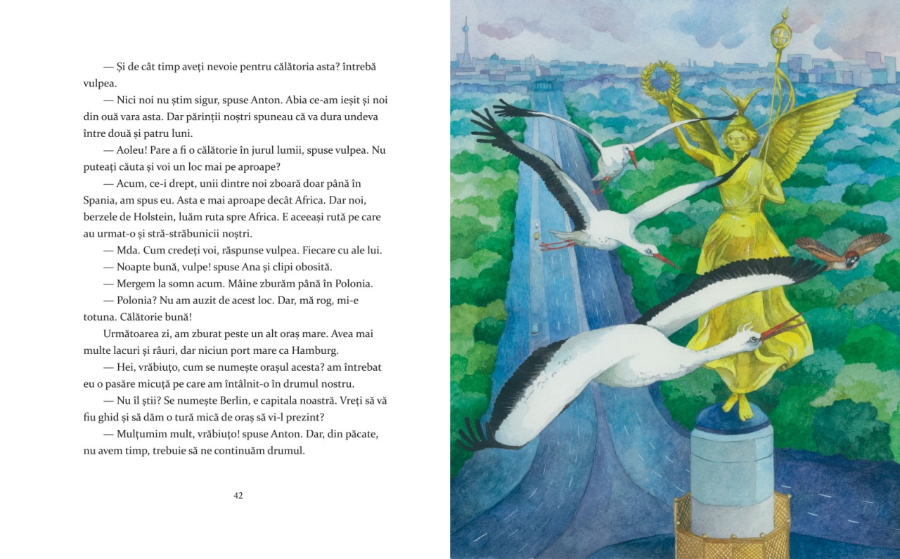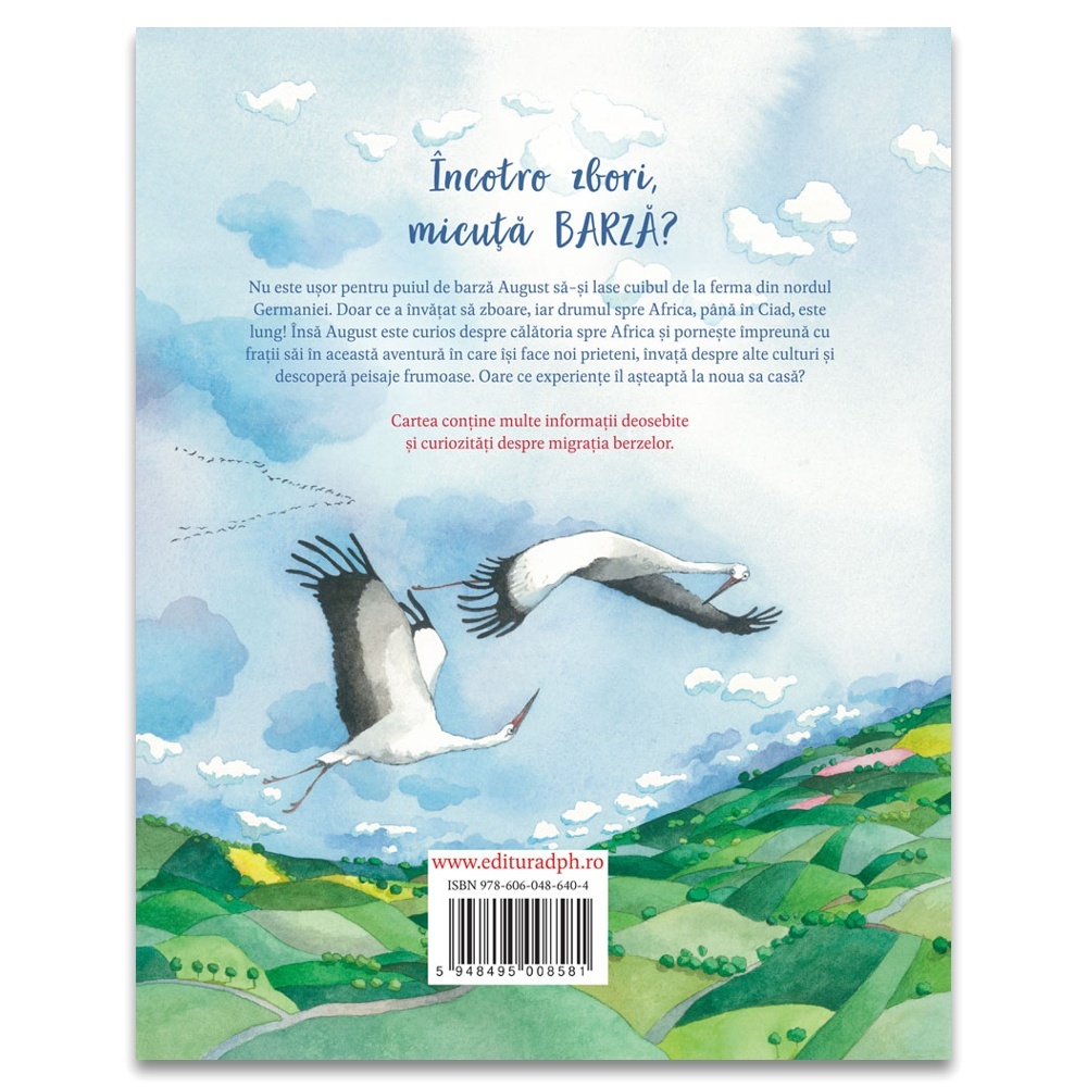 Nu este ușor pentru puiul de barză August să-și lase cuibul de la ferma din nordul Germaniei. Doar ce a învățat să zboare, iar drumul spre Africa, până în Ciad, este lung! Însă August este curios despre călătoria spre Africa și pornește împreună cu frații săi în această aventură în care își face noi prieteni, învață despre alte culturi și descoperă peisaje frumoase. Oare ce experiențe îl așteaptă la noua casă? *Cartea conține multe informații deosebite și curiozități despre migrația berzelor. Caracteristici: Pagini: 120 Mărimi: 20*24,5 Autori: Maren von Klitzing Traducător: Elisabeta Ursu Copertă: Cartonată Grupa de vârstă: 4-6 ani Numărul proiectului: 101059305 Project name: Literatura europeana pentru copii despre ecologie si mediu Project acronym: LECEM