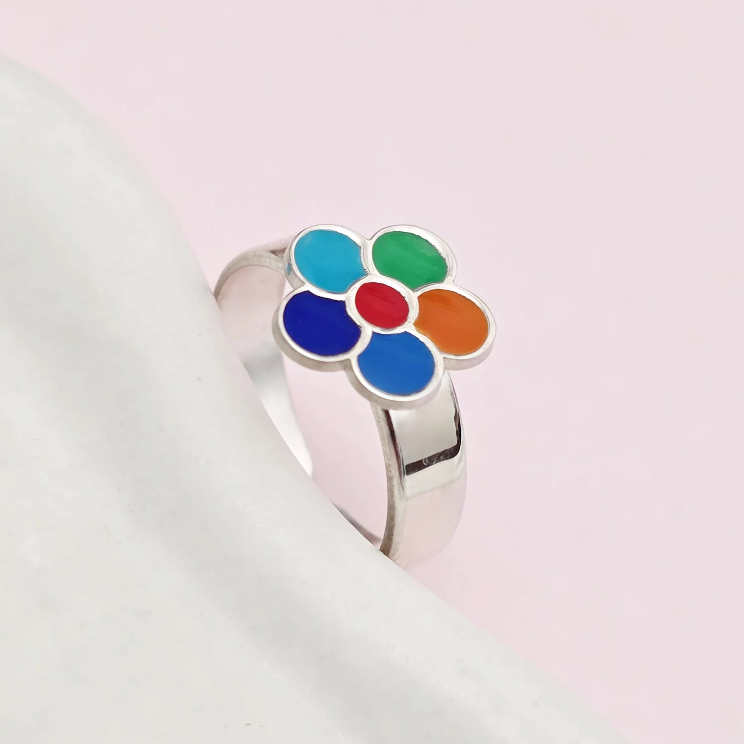 Un inel ce va fi piesa de rezistenta pentru oricare tinuta a micutei tale domnisoare. Cu doar cantitatea potrivita de personalitate si stralucire, inelul nostru cu floare multicolora va aduce putina culoare in fiecare zi fetitei chic din viata ta. Inelul poate fi transformat intr-un set alaturi de perechea de cercei asortata si colierul cu pandantiv floare multicolora si banut gravat cu nume si cu o inima decupata. Despre produs: Inelul este creat din Argint 925. Floarea are dimensiunea de 10 mm. Acesta este decorata cu mai multe culori de email, astfel ca, bijuteria prinde viata si personalitate. Inelul este este reglabil, insa pentru o potrivire cat mai perfecta te rugam sa notezi marimea inelului. Bijuteria va ajunge la tine intr-o cutiuta de bijuterii eleganta, impreuna cu certificatul de calitate ce atesta autenticitatea materialelor folosite. Gramaj aproximativ ARGINT 925:2.08 grame Aceasta bijuterie personalizata este realizata de la zero pentru fiecare comanda in parte. Dupa plasarea si confirmarea comenzii incepe procesul ei de creatie: Realizare Design -> Taiere/Personalizare -> Finisare manuala -> Polish Final -> Ambalare -> Livrare! Datorita procesului de productie si a personalizarii bijuteriei dupa propria dorinta gramajul final al produsului poate fi diferit. Din acest motiv pe site este afisat gramajul obtinut prin catarirea produsului realizat in pozele de prezentare. Pretul produsului include pe langa costul gramului de Argint 925 si tot procesul de mai sus, necesar pentru realizarea unui produs cu adevarat special pentru tine. Toate produsele din Argint 925 comercializate de Chic Bijoux sunt marcate cu titlul Argintului· 925 · *** Pentru o potrivire cat mai perfecta te rugam sa notezi marimea inelului. *** Daca nu stii care e marimea ta sau a persoanei careia doresti sa ii faci cadou inelul, articolul Cum afli corect marimea inelului tau? de pe blogul Chic Bijoux iti vine in ajutor. Dupa plasarea comenzii veti fi contactat de o colega din echipa Chic Bijoux pentru toate detaliile necesare personalizarii produsului.
