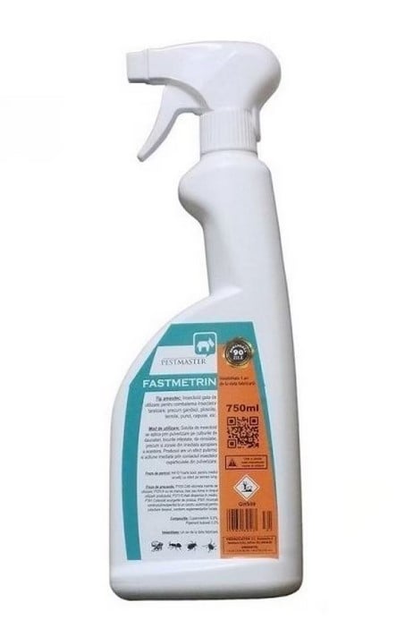 Descriere: Substanta activa: Cypermethrin 0.3%; Piperonil Butoxid 0.2%. Mod de prezentare: 750 ml Remanenta: 90 zile Insecte combatute: gandaci, capuse, plosnite, purici, termite etc. Valabilitate: 1 an de la data fabricarii Mod de actiune: Fastmetrin este un insecticid profesional cu actiune imediata si puternica prin contactul insectelor cu particulele din pulverizare, ce combate insectele taratoare cu o raza mare de actiune prezentand urmatoarele propietati: se poate utiliza pentru spatii alimentare, birouri, mijloace de transport, depozite, fabrici, hale, grajduri, gradini, gradinite, crese etc. Se va aplica prin pulverizare, insecticidul este ambalat intr-un PET cu pulverizator, pentru a usura procesul de aplicare. Produsul vine insotit de aviz sanitar (pentru firme). Alte informatii: Producator: Pestmaster Model: Fastmetrin 750 ml