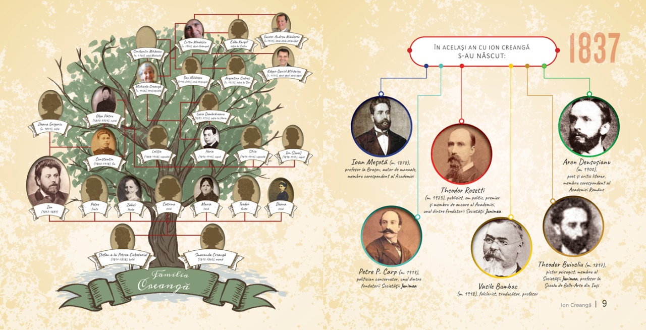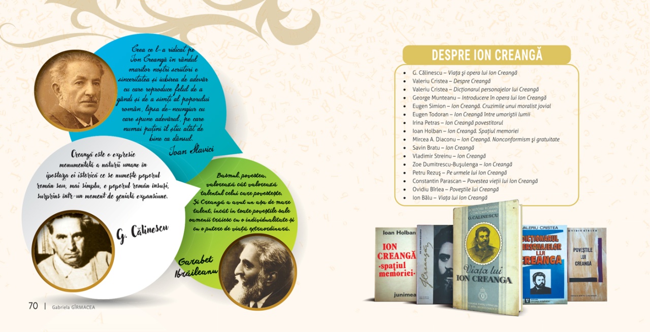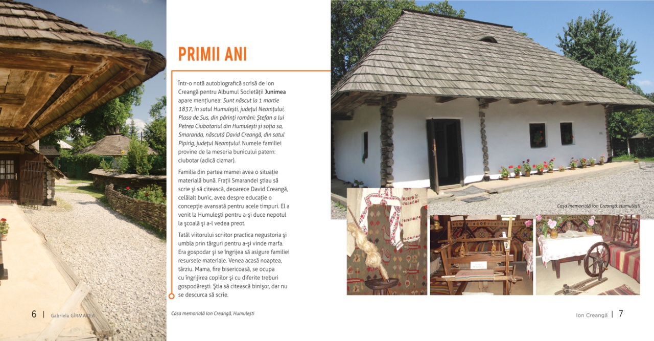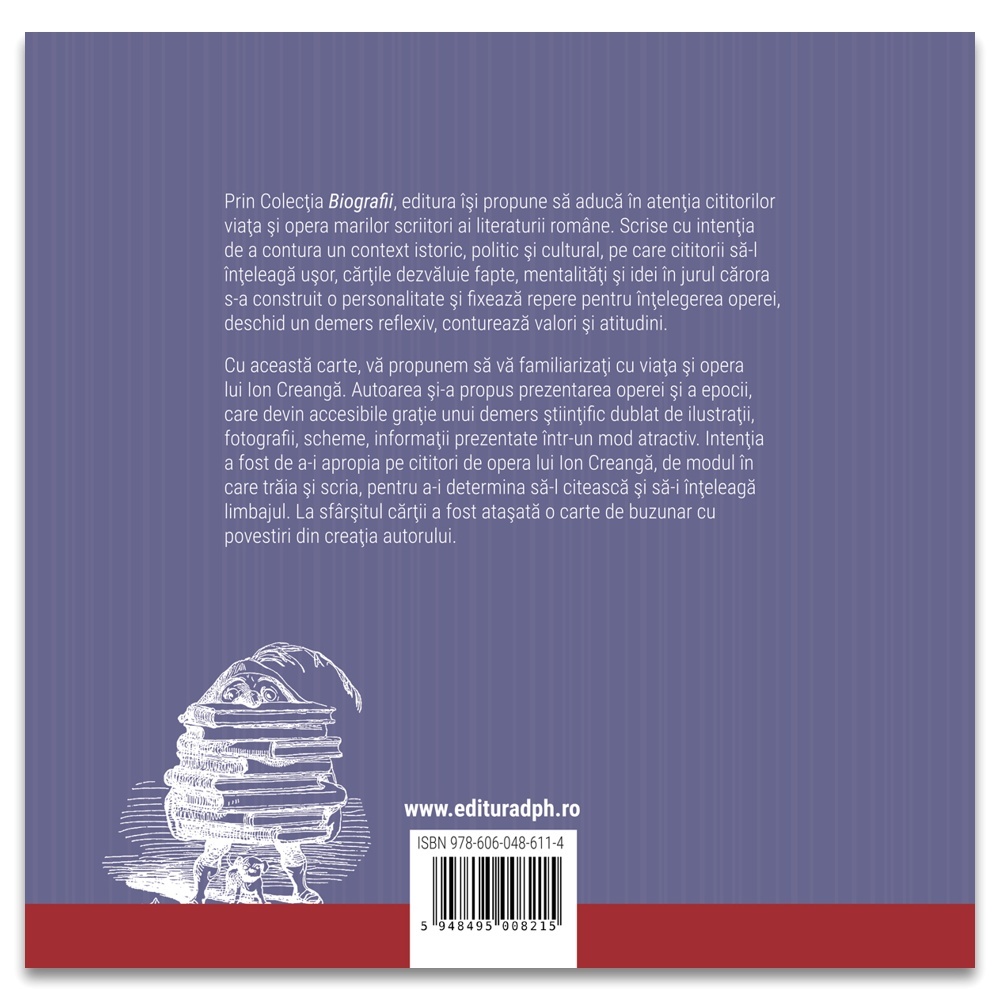 Prin colecția Biografii, editura își propune să aducă în atenția cititorilor personalități ale culturii române. Scrise cu intenția de a contura un context istoric, politic și cultural, pe care cititorii să-l înțeleagă ușor, cărțile dezvăluie fapte, mentalități și idei în jurul cărora s-a construit o personalitate și fixează repere pentru înțelegerea operei, deschid un demers reflexiv, conturează valori și atitudini. Cu această carte, vă propunem să vă familiarizați cu viața și opera lui Ion Creangă. Autoarea și-a propus prezentarea operei și a epocii, care devin accesibile grație unui demers științific dublat de ilustrații, fotografii, scheme, informații prezentate într-un mod atractiv. Intenția a fost de a-i apropia pe cititori de opera lui Ion Creangă, de modul în care trăia și scria, pentru a-i determina să-l citească și să-i înțeleagă limbajul. La sfârșitul cărții a fost atașată o carte de buzunar cu povestiri din creația autorului. Caracteristici: Pagini: Carte mare: 76 / Carte mică: 24 Mărimi: Carte mare: 21,5 x 21,5 / Carte mică:21 x 14,8 Autor: Gabriela Gîrmacea Copertă: Necartonată Grupa de vârstă: 10 ani +
