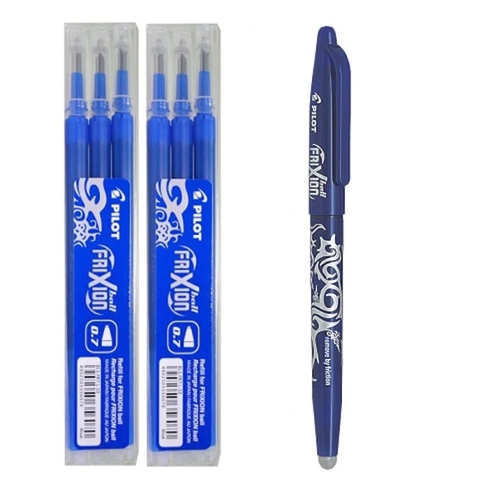 Set roller Pilot Frixion, roller 0.7 si 6 rezerve 0.7, albastru