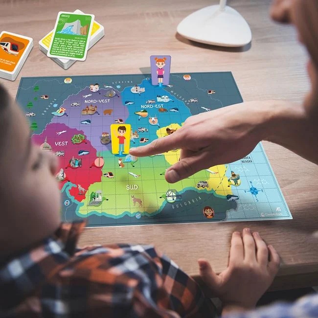 Joc de societate „Cunosc România”, multicolor Descriere produs:Descoperă frumusețile și diversitatea țării noastre prin joacă cu jocul de societate „Cunosc România”, ideal pentru copii, adolescenți și adulți deopotrivă! Acest joc educativ îți testează și îți îmbogățește cunoștințele despre geografia, istoria, cultura, tradițiile și orașele din România într-un mod interactiv și distractiv. Cu un design viu colorat și conținut atractiv, jocul este perfect pentru activități educative în familie, la școală sau în cercuri de prieteni. Caracteristici produs:Tip produs: Joc educativ de cultură generală – „Cunosc România” Vârsta recomandată: 7+ ani Număr jucători: 2–6 persoane Material: Carton și plastic de calitate Culoare: Multicolor (grafică veselă, specifică temei românești) Utilizare: Joc educativ, activități de grup, lecții interactive Beneficii: Dezvoltă cultura generală, memoria, atenția, logica și spiritul de competiție Detalii suplimentare:Include tablă de joc, cartonașe cu întrebări, pioni și zar Întrebări variate, adaptate diferitelor niveluri de vârstă Ideal pentru activități în familie, la școală sau ca instrument educativ Joc ușor de înțeles și captivant, potrivit pentru toate vârstele Perfect pentru cadouri, tabere educaționale sau serile de joc Cu „Cunosc România”, învățarea devine o aventură – un mod inteligent și distractiv de a explora țara și a-ți testa cunoștințele alături de cei dragi!