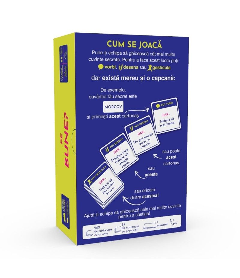 Joc de Societate PE BUNE? (Joc de Ghicit Cuvinte cu Restricții) – Oferta En-Gros Descriere Produs: Pe Bune? este un joc de societate amuzant și dinamic, bazat pe ghicitul cuvintelor, care adaugă o capcană surprinzătoare la mecanica clasică. Jucătorii încearcă să transmită echipei lor cuvinte secrete prin vorbire, desen sau gesticulare, dar trebuie să respecte întotdeauna o restricție suplimentară impusă de un cartonaș capcană. Restricțiile pot varia de la Trebuie să scoți limba sau Nu poți atinge pixul cu mâinile, până la Trebuie să te învârți în cerc – transformând procesul de comunicare într-o serie de momente hilarante. Această variantă în limba română (RO) este ideală pentru petreceri, adunări de grup și pentru dezvoltarea rapidă a vocabularului și a abilităților de comunicare non-verbală, sub presiunea timpului. Ideal pentru: Magazine de jocuri de societate și hobby-uri, librării, magazine de cadouri și articole de petrecere, retaileri online specializați în jocuri de grup și de familie. Avantaje pentru Achiziții En-Gros (B2B): Mecanism Inovator: Combinația dintre ghicitul clasic și restricțiile absurde (capcanele) oferă o rejucabilitate ridicată și o experiență unică, diferențiind produsul la raft. Vânzare de Petrecere (Party Game): Jocurile care generează râsete și interacțiune intensă sunt extrem de populare, asigurând un rulaj rapid al stocului. Format Compact și Complet: Cutia conține 200 de cartonașe cu cuvinte, 55 de cartonașe cu provocări, carnetel și pix, fiind un produs complet, gata de joc. Accesibilitate pe Piața Locală: Fiind integral în limba română, se adresează unui public larg, inclusiv celor care nu sunt familiarizați cu jocurile de import. Marjă Atractivă: Datorită formatului party game și a componentelor simple (cărți), costul de achiziție en-gros permite retailerilor să obțină o marjă de profit generoasă.