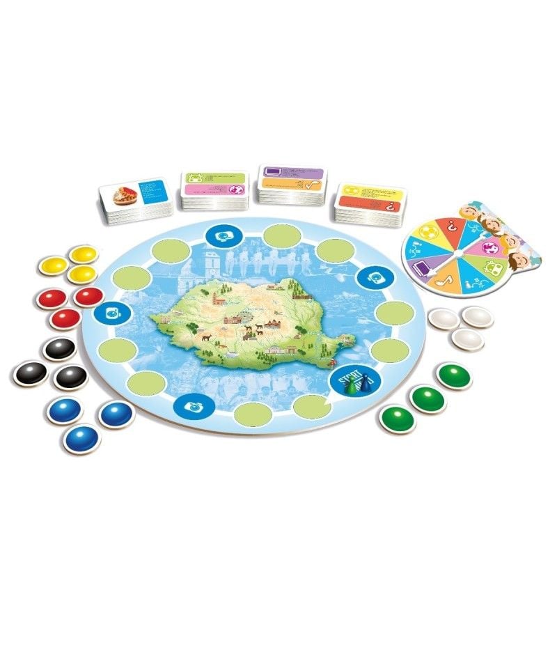 Joc de societate Trivia Junior România – Ediție Educațională Locală – Engros Trivia Junior România este un joc de societate de tip trivia special conceput pentru copii și familii, axat pe cunoștințe generale și specifice despre România (geografie, istorie, cultură, tradiții). Imaginea arată o tablă de joc în formă de cerc cu harta României în centru, pioni colorați, cărți cu întrebări din diferite categorii și o roată a sorții, sugerând un format de joc distractiv și educativ. Acest produs este ideal pentru magazine de jucării, librării, distribuitori de materiale didactice și jocuri educative, precum și pentru retaileri online cu focus pe dezvoltarea copiilor. Fiind un produs localizat pe cunoștințe românești, are o cerere stabilă din partea părinților și școlilor care doresc să combine distracția cu educația patriotică. Avantaje pentru achiziții Engros (B2B): Nivel Educațional Ridicat: Foarte căutat de părinți și bunici pentru valoarea sa educativă, asigurând încrederea și vânzarea. Teme Localizate: Axat pe România (geografie, monumente, animale), umplând o nișă importantă pe piața jocurilor locale. Public Țintă Clar: Conceput pentru copii (Junior), ajută la plasarea și promovarea eficientă în segmentul de vârstă 6-12 ani. Joc de Familie: Promovează interacțiunea dintre generații, mărind atractivitatea pentru cumpărătorul final. Set Complet și Colorat: Componente multiple (hartă, roată, pioni, cărți), asigurând percepția unei valori mari a produsului.