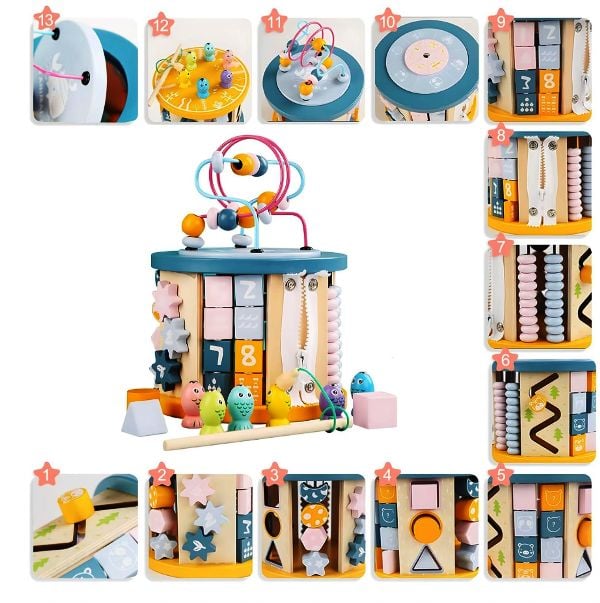 Jucarie Montessori din lemn , dezvolta motricitatea ,ajută la învățarea culorilor, formelor și numelor de animale și vehicule. Contine: cuburi rotative cu forme geometricemecanism cu roti zimtatecuburi reversibile cu cifrelabirint 3D cu bilute,in partea superioara,care este detasabiljoc rotativ in partea superioara – cu ce mananca animalelefermoar – specific busy board-uluisortator forme cu decupajeabac cu bile colorateaxe paralele cu joc puzzlejoc de pescuit magnetic undita si pestisorilabirint 2D Dimensiune cub montat : 24*17*17 cm