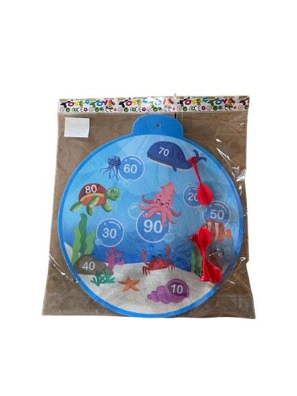 Jucărie țintă 1819118 – Dartboard marin pentru copii Joc distractiv și educativ pentru copii, cu tematică marină. Setul conține o țintă colorată din material textil și săgeți cu vârfuri moi, sigure pentru utilizare. Ideal pentru dezvoltarea coordonării mână-ochi și a concentrării, oferind în același timp o activitate de joacă plină de amuzament. Caracteristici: Model: 1819118 Tip produs: joc țintă pentru copii Design: tematică oceanică cu animale marine Conținut: 1 țintă + 2 săgeți cu ventuze Material: textil și plastic Dimensiune aproximativă: 30 cm diametru Vârstă recomandată: 3+ ani Utilizare: pentru joacă interioară sau exterioară Avantaje: Sigur pentru copii, fără piese ascuțite Încurajează precizia și coordonarea Design atractiv și colorat