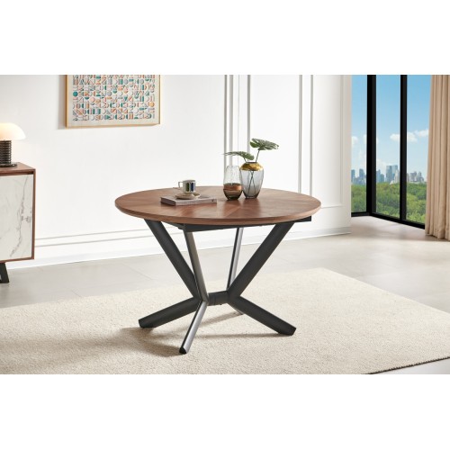 Masa extensibila Spectral 005 Dimensiuni: Lungime: 120 - 160 cm Latime: 120 cm Inaltime: 76 cm Materiale: Cadru: Fier vopsit negru Blat din MDF de culoare Nuc Lacuit cu tesitura inversa pe margine