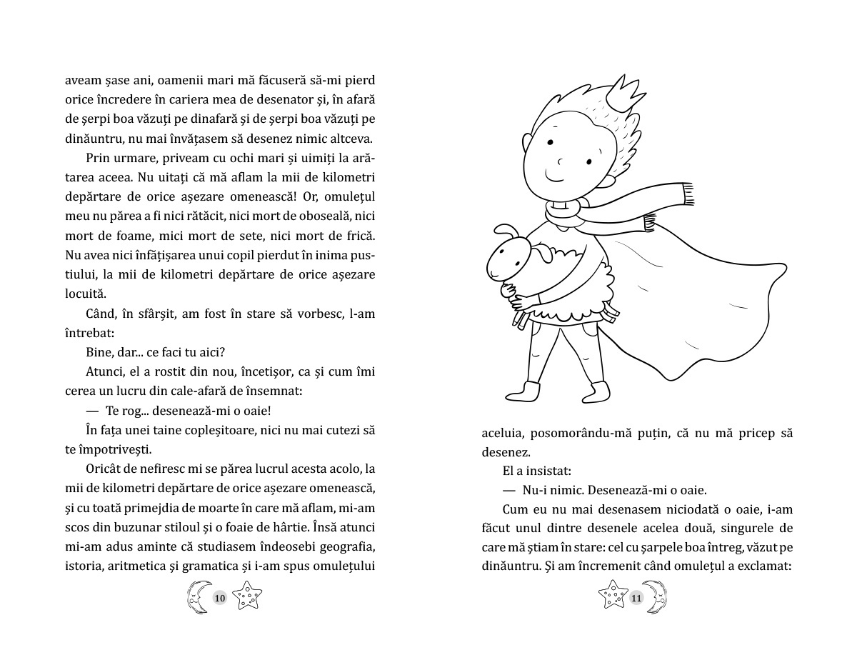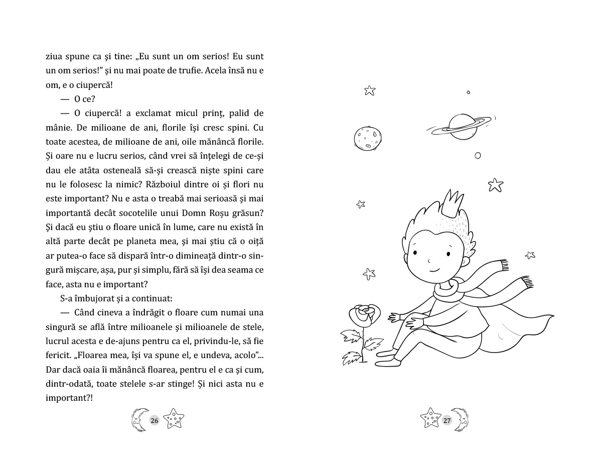 Această poveste clasică, una dintre cele mai iubite opere literare din toate timpurile, ne invită să explorăm magia copilăriei, valoarea prieteniei și esența umană dincolo de aparențe. Prin ochii Micului Prinț, un personaj inocent și plin de curiozitate, cititorii descoperă o perspectivă poetică asupra vieții și a relațiilor umane. Aventurile lui în călătoria printre planete aduc în prim-plan întâlniri memorabile cu personaje simbolice, precum regele, vanitosul sau lampagiul, fiecare reprezentând aspecte ale comportamentului uman. Această ediție este îmbogățită cu ilustrații care surprind farmecul poveștii, oferind o experiență vizuală deosebită pentru cititori de toate vârstele. Textul, accesibil și emoționant, face din Micul Prinț o lectură ideală pentru copii, adolescenți și adulți care vor să redescopere frumusețea lucrurilor simple și importanța sentimentelor autentice. Cartea „Micul Prinț” este un cadou literar neprețuit, care va inspira cititorii să își păstreze curiozitatea și bunătatea sufletească. Caracteristici: Autori: Antoine de Saint-Exupéry Pagini: 96 Mărimi: 14*21 Copertă: Necartonată Vârstă: 7 ani +