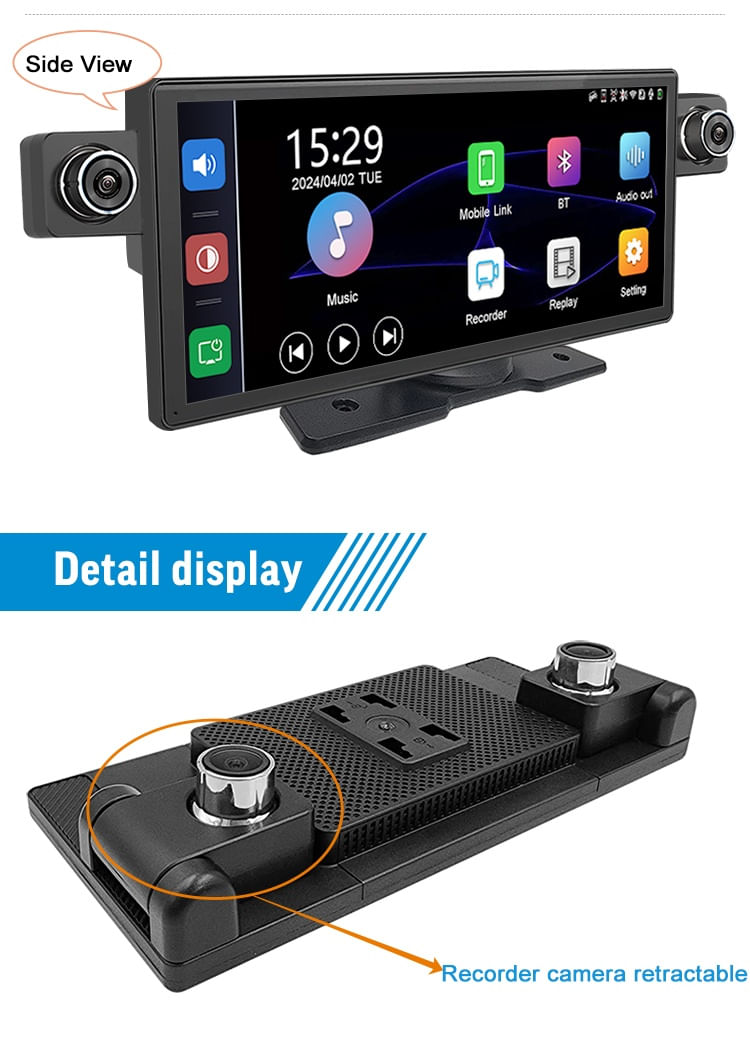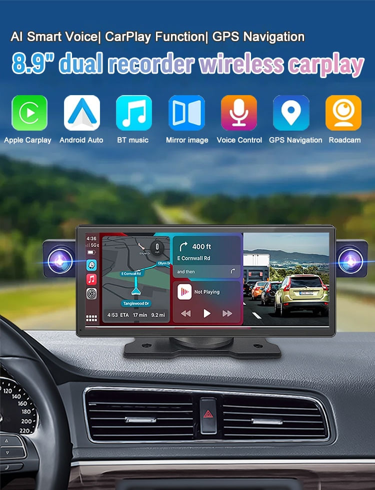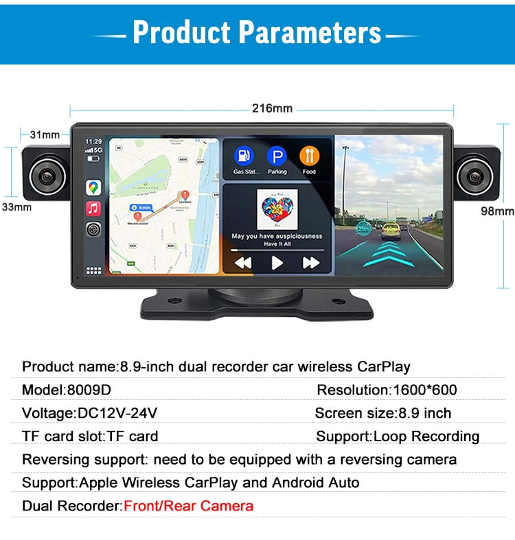 Sistem de Navigatie Auto 8.9 cu Dual Recorder, CarPlay Wireless, Android Auto si Functii AvansateDescopera o experienta de condus de neegalat cu sistemul de navigatie auto de 8.9 inch, dotat cu tehnologie de ultima generatie, functii de siguranta avansate si conectivitate extinsa. Ideal pentru cei care doresc sa îmbine confortul, divertismentul si siguranta în timpul calatoriilor.Ecran si înregistrare video de topDisplay IPS de 8.9 inch, cu rezolutie HD 1600x600, ofera imagini clare si o interfata usor de navigat, chiar si în lumina puternica.Dual Recorder cu camere frontale si spate: Camera frontala filmeaza în 2.5K Ultra HD, iar camera spate în 1080p Full HD, pentru o vizibilitate perfecta în orice conditii.Mod de înregistrare în bucla: Videoclipurile se suprascriu automat, eliminând necesitatea stergerii manuale.Blocare automata la impact: Evenimentele importante sunt salvate automat pentru a preveni pierderea lor.Asistenta la parcare: Camera din spate ofera linii de ghidare pentru parcare, facând manevrele mai sigure si mai precise.Conectivitate si functionalitati inteligenteApple CarPlay Wireless si Android Auto: Acces rapid si usor la aplicatiile tale preferate, cum ar fi harti, muzica, apeluri si mesaje, direct pe ecranul dispozitivului.Bluetooth integrat: Permite apeluri hands-free si redare de muzica cu o conexiune rapida si stabila.MirrorLink: Compatibil cu dispozitive Apple si Android pentru oglindirea ecranului telefonului pe sistemul auto.Asistent vocal integrat: Controleaza functiile dispozitivului cu Siri sau Google Assistant, pentru o experienta complet hands-free.Performanta si design modernFunctie retractabila a camerei: Asigura ajustarea unghiului pentru o înregistrare optima.Design elegant si compact: Cu dimensiuni de 216mm x 98mm, se potriveste perfect pe orice bord auto.Navigatie precisa: Suport pentru CarPlay si Android Auto, cu utilizarea aplicatiilor de harti din telefonul tau.Moduri multiple de operare: Poti comuta între vizualizarea camerei frontale, camerei spate, modurile CarPlay sau combinatiile acestora.Caracteristici aditionale:Suport pentru înregistrare video continua si de urgenta.Redare audio prin Bluetooth, TF Card, AUX si USB.Compatibilitate cu majoritatea vehiculelor (12V-24V).Accesorii incluse:Cablu de alimentare pentru bricheta 12V.Cablu video pentru camera de marsarier.Camera HD pentru mersul înapoi.Specificatii tehnice:Model: 8009DVoltaj: DC 12-24VRezolutie video: 2.5K Ultra HD (frontal), 1080p Full HD (spate).Dimensiuni: 216mm x 98mm x 33mm.Slot TF Card: Suport pentru stocare extinsa.Bucura-te de siguranta, divertisment si control total la volan cu acest sistem de navigatie auto avansat. Ideal pentru orice sofer care doreste sa transforme fiecare calatorie într-o experienta premium!