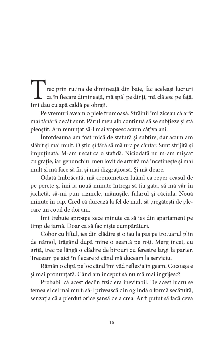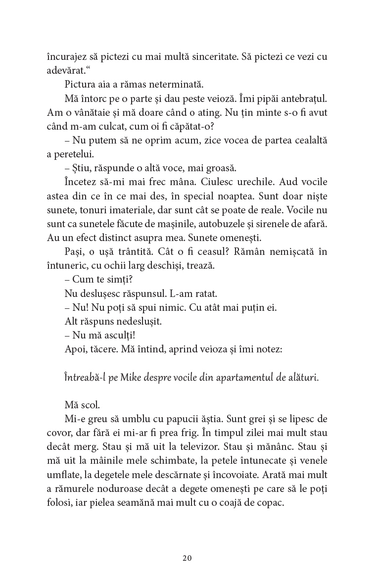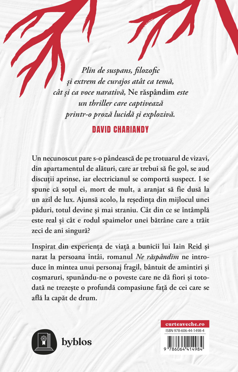Un thriller in care granita dintre realitate si reflexia propriilor noastre spaime e aproape invizibila.Un necunoscut pare s-o pandeasca de pe trotuarul de vizavi, din apartamentul de alaturi, care ar trebui sa fie gol, se aud discutii aprinse, iar electricianul se comporta suspect. I se spune ca sotul ei, mort de mult, a aranjat sa fie dusa la un azil de lux. Ajunsa acolo, la resedinta din mijlocul unei paduri, totul devine si mai straniu. Cat din ce se intampla este real si cat e rodul spaimelor unei batrane care a trait zeci de ani singura?Inspirat din experienta de viata a bunicii lui Iain Reid si narat la persoana intai, romanul Ne raspandim ne introduce in mintea unui personaj fragil, bantuit de amintiri si cosmaruri, spunandu-ne o poveste care ne da fiori si totodata ne trezeste o profunda compasiune fata de cei care se afla la capat de drum.