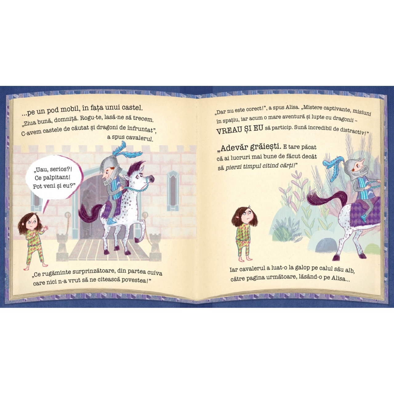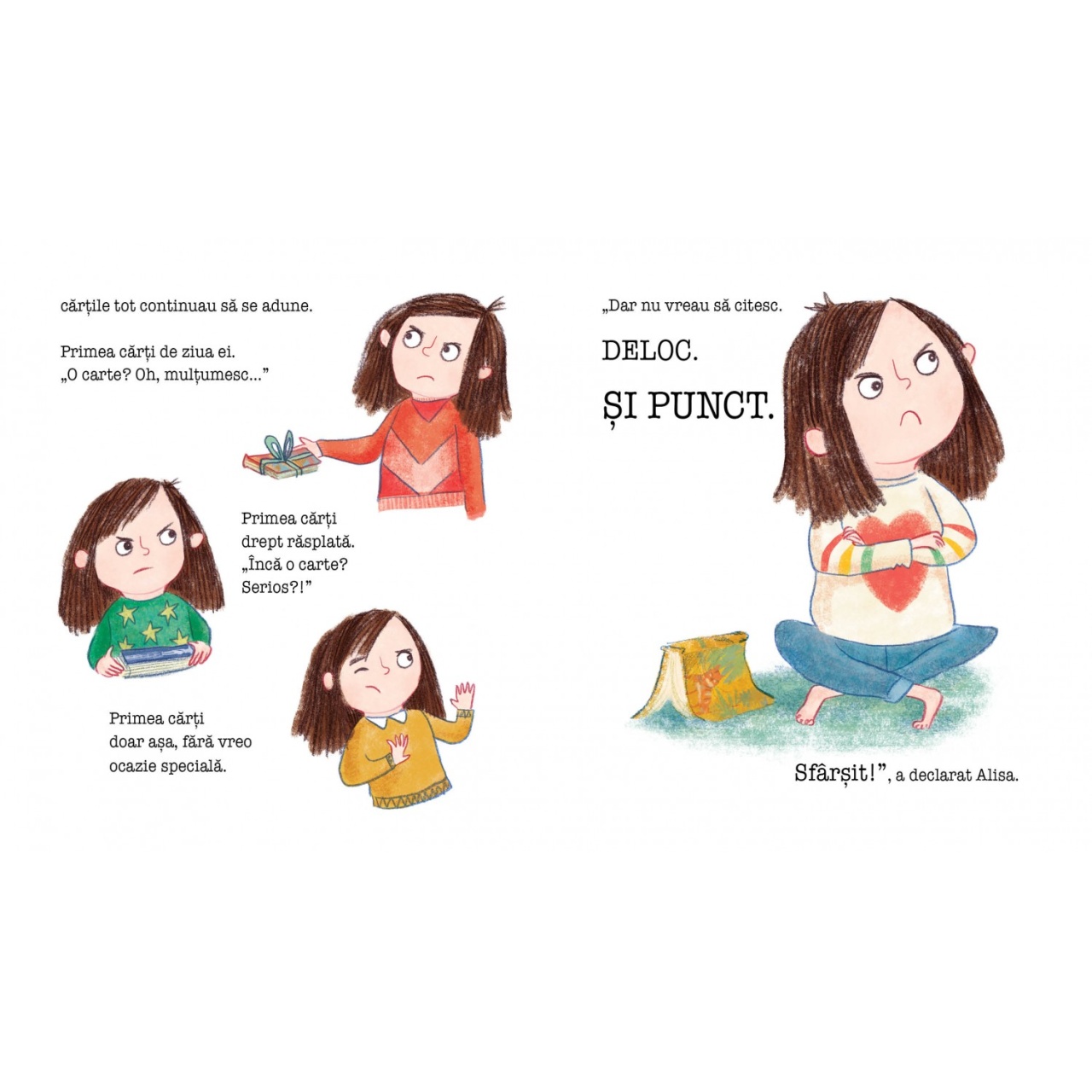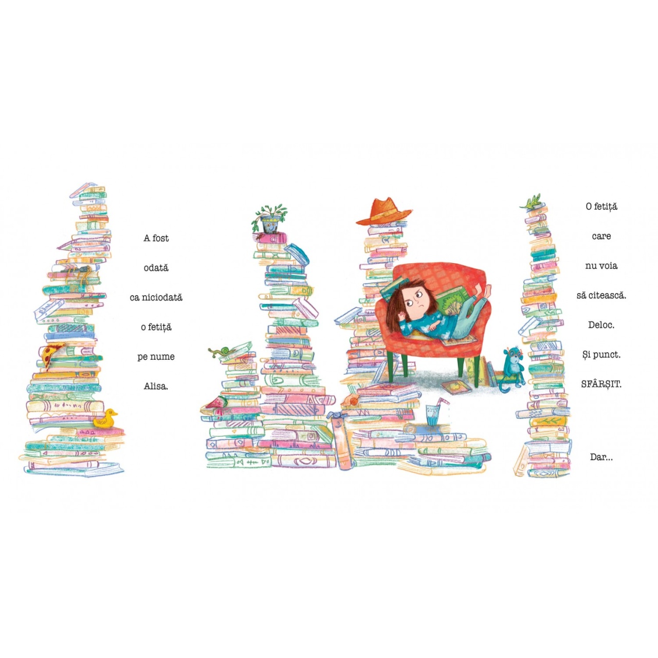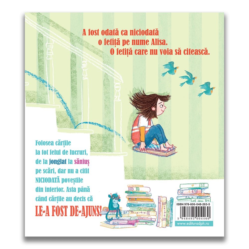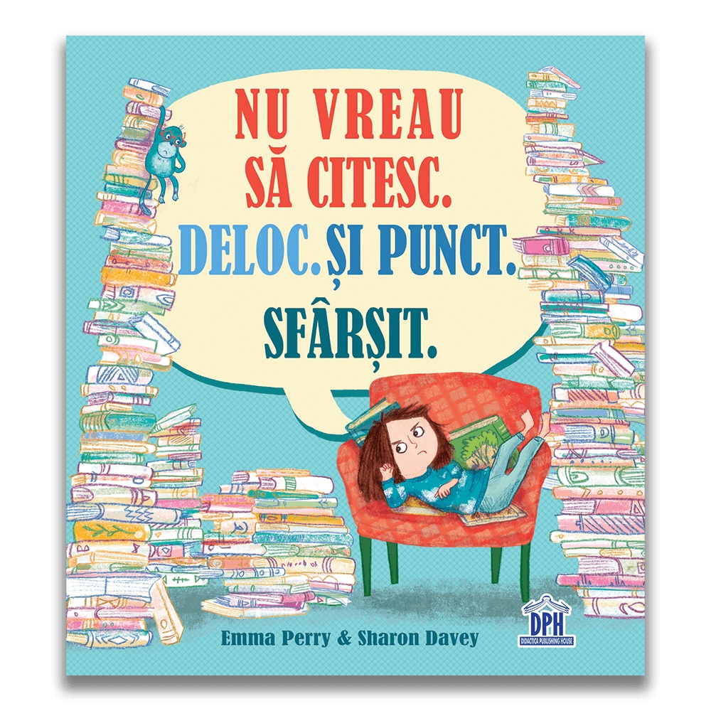Nu vreau să citesc. Deloc. Și punct. Sfârșit. este o carte ideală pentru a fi împărtășită cu copiii cu vârsta peste 3 ani, deoarece este foarte detaliată și demonstrează cu cea mai ușoară atingere cum citirea unei cărți te poate transporta în alte locuri și experiențe. Faceți cunoștință cu Alisa, o fetiță care nu voia să citească. Ea are o mulțime de cărți pentru că, ei bine, oamenii continuă să i le dea! Dar, cu siguranță, nu-i plac cărțile – cel puțin, cu excepția cazului în care alunecă pe scări pe ele, jonglează cu ele sau le folosește pe post de opritoare de ușă ca să nu intre nimeni în camera ei. Dar cărțile Alisei s-au săturat să fie folosite greșit și decid să ia lucrurile în paginile lor, pentru a-i arăta exact ce îi lipsește respingând poveștile din interiorul lor. Într-o noapte, Alisa observă cum cărțile ei încep să zboare prin toată camera și se aud doar foșnete de pagini. Este vorba despre cărți care prind viață pentru a-i inspira unui cititor reticent fiorul lecturii. Ei bine, va trebui să citiți cartea pentru a descoperi aventura prin care trece Alisa și să aflați cum ajunge să iubească toate cărțile. O poveste frumoasă, amuzantă, pe care nu trebuie să o ratați! Cărțile nu sunt hârtie și cuvinte, sunt aventuri pline de primejdii și căutări și fapte importante. DESPRE AUTOR: Emma Perry poate fi găsită fie scriind cărți, fie citindu-le sau învățându-le. A fost întotdeauna așa. De fapt, primele sale două cărți ilustrate sunt despre cărți. Este fondatorul site-ului premiat pentru recenzii de cărți pentru copii MyBookCorner și organizatoare a Zilei Internaționale a Oferirii Cărții. Îi place să fie la curent cu cele mai bune cărți din literatura pentru copii și să le transmită lumii. Și, în calitate de profesor de școală primară, adoră să împărtășească acele povești cu elevii săi. Acum locuiește în Bath, Marea Britanie, împreună cu soțul său, cei doi copii, două pisici și o grămadă mare de cărți. Sharon Davey este o ilustratoare de cărți pentru copii care are un trecut în Teatrul de Design. Prima ei carte ilustrată a fost lansată în iulie 2018. Specificații Vârstă: 3+ Pagini: 32 Mărimi: 23.5 x 26.5 cm Copertă: Cartonată