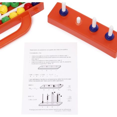 Abac multibase interactiv cu valiză educativă – set complet cu 40 bile colorate și 16 tije ✅ Invățare matematică prin joc interactiv Acest abac multibase interactiv este conceput special pentru a ajuta copiii să exploreze într-un mod practic conceptele de bază ale matematicii. Cu 40 de bile colorate în 4 culori și 16 tije de dimensiuni diferite, copiii pot învăța despre numere, operații și valoare numerică într-un mod distractiv și intuitiv. ✅ Set educativ complet Valiza include toate componentele necesare pentru o experiență educațională completă: bază de susținere, tije și bile – toate gândite pentru a facilita învățarea progresivă a conceptelor matematice. Ideal pentru utilizare acasă sau în școli. ✅ Material didactic versatil Dincolo de aritmetică, copiii pot utiliza abacul pentru exerciții de seriatie, asociere pe culori, dezvoltarea gândirii logice și înțelegerea valorii poziționale a cifrelor. O unealtă esențială în învățarea timpurie. ✅ Calitate și siguranță garantate Produs în Italia din material plastic netoxic, acest set este certificat CE și conform cu standardele UNI EN 71-1/2/3. Toate piesele sunt durabile, sigure și conforme cu normele europene pentru jucării educative. ✅ Ușor de curățat și refolosit Componentele sunt lavabile și reutilizabile, iar valiza de transport le păstrează bine organizate, fiind perfectă pentru transport și depozitare. [img-373181-left-thickbox_default] [img-373184-left-thickbox_default] ⚠️ Avertisment: Nu este recomandat copiilor sub 3 ani – conține piese mici care pot fi înghițite. A se utiliza sub supravegherea unui adult. A se păstra produsul departe de surse de foc sau temperaturi extreme.