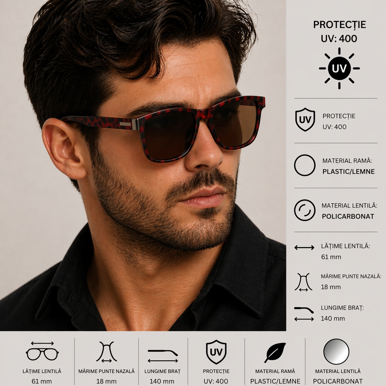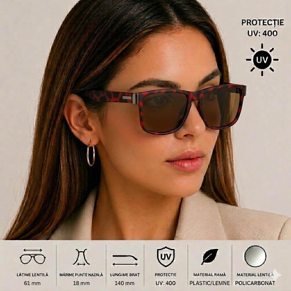 protectie UV: 400 material rama: plastic; material lentila: ploicarbonat; latime lentila: 61 mm; marime punte nazala: 18 mm; lungime brat: 140 mm. Important : A se evita socurile termice si mecanice, zgarierea, contactul cu alcool, parfum, acetona, detergent, suprafete abrazive.