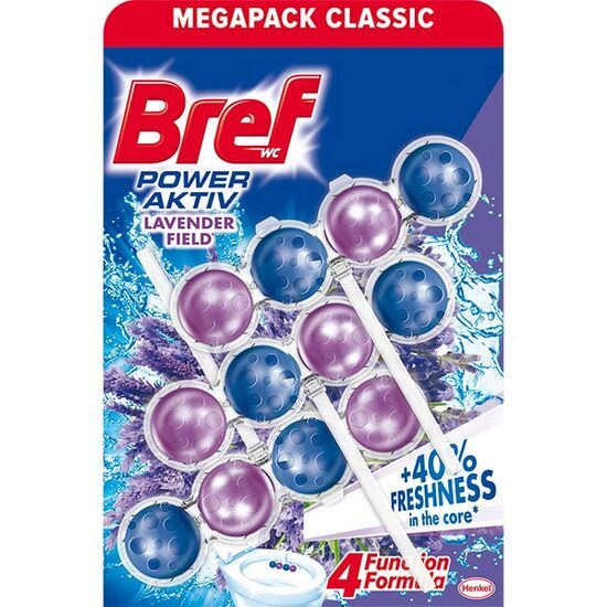 Odorizant toaleta Bref Power Aktiv Lavanda, 3x50 g• Bref Power Aktiv ofera curatenie si prospetime de la primul pana la ultimul jet de apa;• Bref Power Aktiv iti ofera 4 beneficii functionale: spuma de curatare, parfum indelungat, elimina calcarul si protejeaza impotriva murdariei;• Toaleta dvs. va ramane curata si improspatata de la primul pana la ultimul jet de apa;• Este foarte usor de utilizat. Pur si simplu atarnati odorizantul sub marginea vasului de toaleta, unde este un debit puternic de apa;• Designul discret se potriveste oricarui tip de toaleta.Cautati o modalitate mai usoara de a va pastra toaleta curata si improspatata? Odorizantul de toaleta Bref Power Aktiv este un mod usor si convenabil de a asigura curatenia si prospetimea toaletei dvs. de la primul pana la ultimul jet de apa. Bref ofera 4 beneficii functionale:Spuma activa de curatare;Previne aparitia calcarului;Previne aparitia murdariei;Parfum de lunga durata.Bref Power Aktiv cu Efectul de improspatare a aerului ofera un parfum de lunga durata.Pur si simplu agatati produsul pe marginea vasului de toaleta si reglati-l in functie de jetul de apa.Pentru reciclare, va rugam sa separati ambalajul din plastic de carton.Parfumuri diferite pentru o prospetime intensa pana la ultimul jet de apaDatorita formulei unice cu 4 functii, Bref Power Aktiv combina spuma de curatare efectul anti-calcar si protectia impotriva murdariei, cu noua tehnologie de improspatare a aerului, care ofera prospetime in baie pana la ultimul jMod ambalare 9/Bax