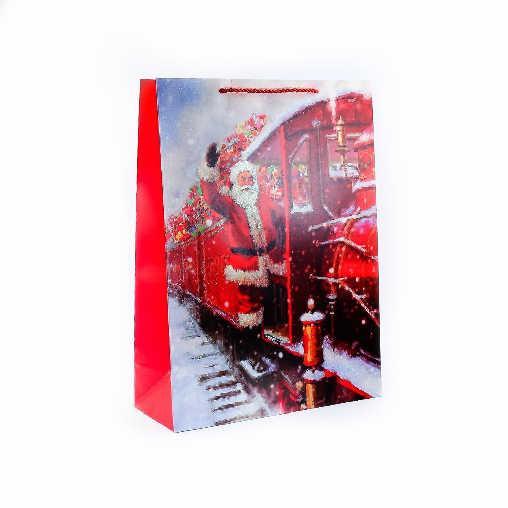 Pachet cu 12 pungi pentru cadouri foarte mari din carton mat gros cu mânere din șiret satinat roșu, în model cu Moș Crăciun. Pungile au o față simplă și una cu sclipici. Dimensiuni : 12x30x41cm Material : Carton + Textil Fabricat în China.