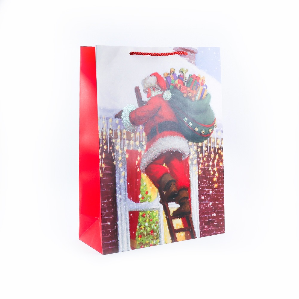 Pachet cu 12 pungi pentru cadouri foarte mari din carton mat gros cu mânere din șiret satinat roșu, în model cu Moș Crăciun. Pungile au o față simplă și una cu sclipici. Dimensiuni : 12x30x41cm Material : Carton + Textil Fabricat în China.