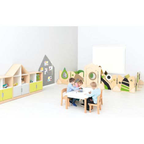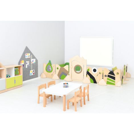 Panourile din gama Flora de la Moje Bambino sunt solutia perfecta pentru a delimita sau creea spatii de joaca interioare destinate copiilor de la crese, gradinite si scoli. Panourile pot separa zonele de joaca de cele destinate pentru invatat, delimitand astfel joaca de orele de curs. Design-ul minimalist si simbolurile care fac referire la natura prezinta o solutie eleganta pentru tematica dorita. Panourile sunt fabricate din placaj lacuit, iar elementele simbolice sunt facute din fetru, avand culori naturale pentru a imita aspectul frunzelor si pietrelor.   Panourile permit decorarea salilor sau a camerelor din crese, gradinite si scoli, precum si delimitarea spatiilor pentnru diferite teamatici sau functii (joaca, invatat, etc.). Simbolurile si ilustratile din natura imita aspectul unui gard rustic stilizat, sau al unei case in mijlocul padurii. Imaginatia copiilor este singura limita! Pentru conectarea panourilor se folosesc separatori speciali, care permit legarea acestora in serie, la unghiuri de 90 de grade sau chiar fixarea pe perete.   Caracteristici produs: • Dimensiuni modul: 71 x 73 cm • Dimensiuni usa: 88 x 123.5 cm • Setul include: Panou Flora 8, cu usa   Nu lasati ambalajele jucariilor/produselor la indemana copiilor. Indepartati orice ambalaj al jucariei/produsului inainte de a da jucaria/produsul copilului. Va rugam sa supravegheati copilul in timp ce se joaca/foloseste acest produs. Pastrati instructiunile si etichetele pentru referinte viitoare. Pastrati jucaria/produsul departe de foc; feriti jucaria/produsul de temperaturi ridicate si umiditate.