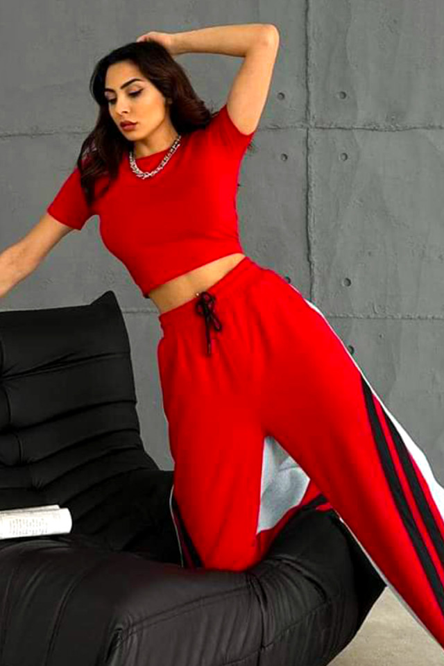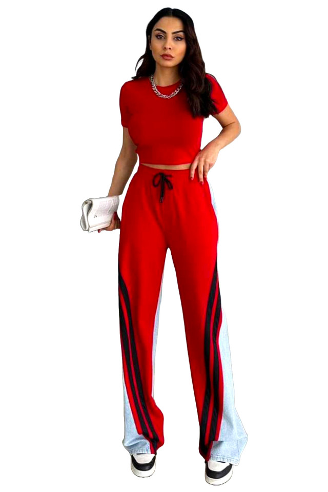 Pantaloni din bumbac Katalea, cu denim, snur in talie si croi lejer, Rosu