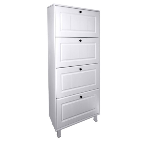Dimensiuni (l x h x a): 594 x 1580 x 257 mm Culoare: Alb Specificatii: Carcasa fabricata din PAL melaminat cu grosimea 16 mm, cu lateralele si capacul cantuite cu cant ABS cu grosimea de 2 mm pentru o rezistenta sporita la lovituri. Usile rabatabile pe verticala, sunt fabricate din MDF infoliat alb mat cu frezare dungi si au cate 2 compartimente de depozitare ceea ce face mai practica si mai confortabila pastrarea incaltamintei. Suportii pantofarului sunt metalici pentru o rezistenta maxima la deschideri frecvente ale usilor. Picioarele sunt din metal, au inaltimea de 10 cm si sunt reglabile. Manerul metalic rotund, culoare negru mat, confera un plus de eleganta acestei piese de mobilier, facand-o sa fie potrivita pentru diverse spatii din locuinta dvs. Atentie!: Inaltimea produsului include si picioarele de 10 cm. *Nota: Schita de montaj nu se afla in interiorul coletului intre piesele de mobila. Schita de montaj o sa fie atasata pe spatele facturii.