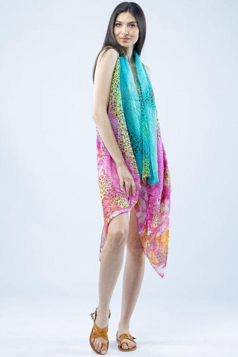 Pareo plaja din material plisat matasos si usor, motive animal print albastre si mov
