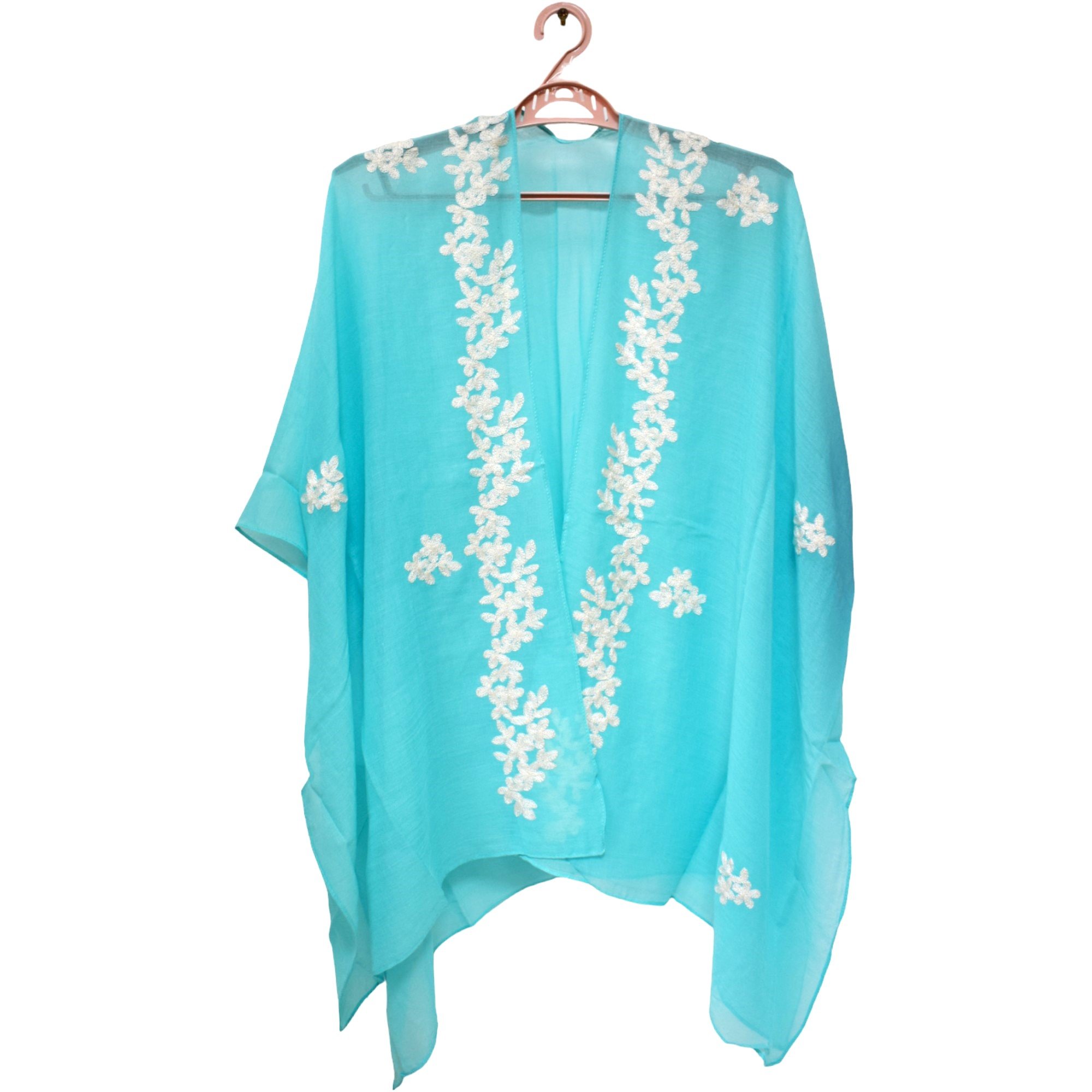 Chimonou de plaja uni accesorizat cu flori albe brodate. Vine perfect in completarea costumelor de baie. Marime universala. Poliester, fibre sintetice.