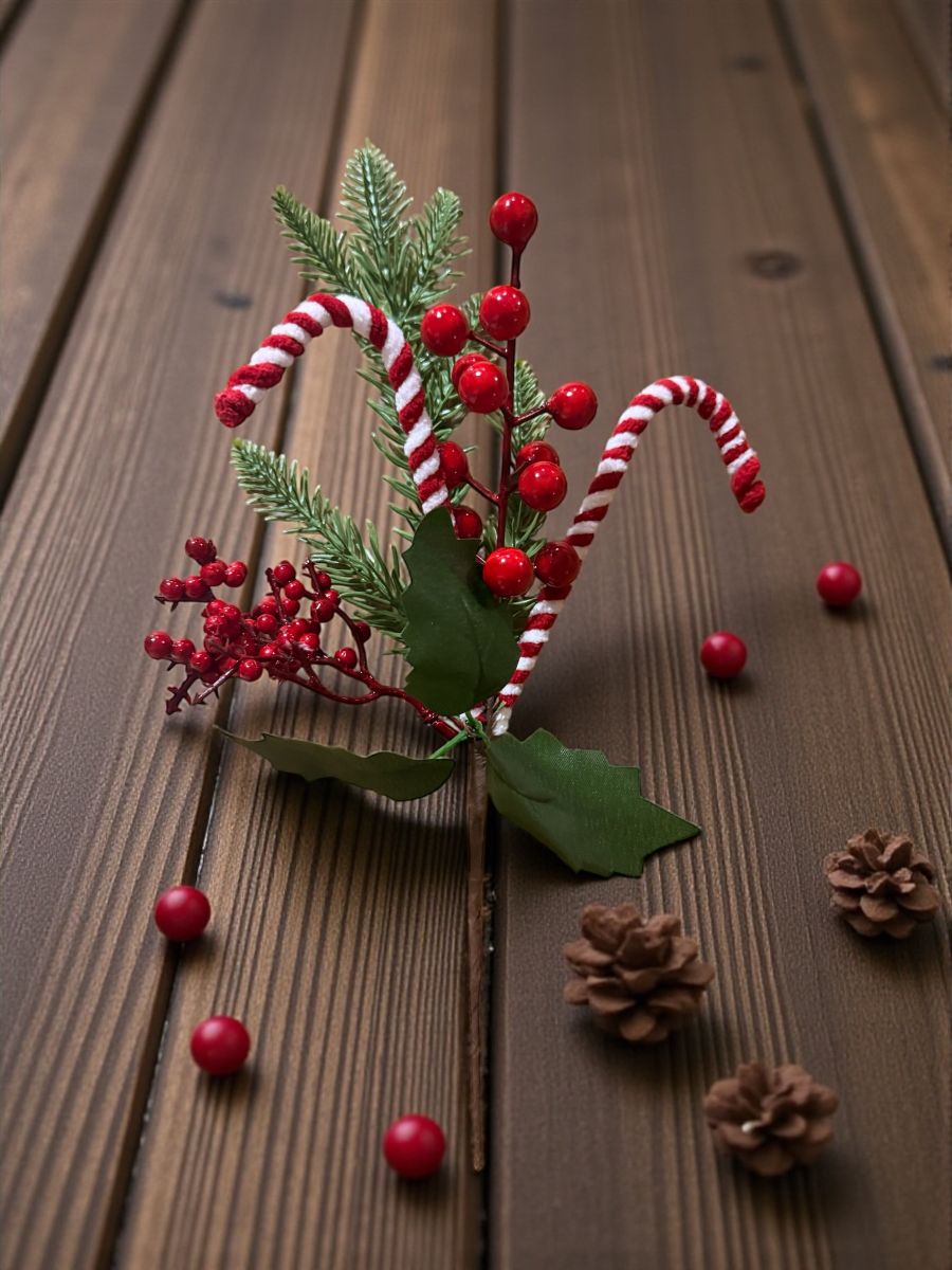 Un pick decorativ vesel și plin de atmosferă de sărbătoare, perfect pentru decorurile clasice de Crăciun. Ramura de 34 cm include crenguțe verzi de brad, bobițe roșii lucioase și două bastonașe candy cane – ideal pentru decoruri în stil tradițional roșu-verde. Recomandat pentru: • aranjamente florale, centrepieces, coronițe și buchete festive • decorarea bradului, cutiilor cadou și coșurilor tematice • vitrine, evenimente, ambalaje premium de Crăciun • proiecte DIY, pachete corporate, decoruri foto • stil: clasic, nordic, „kids Christmas”, candy bar de sărbători Structură flexibilă, ușor de integrat în spumă florală, brad sau suporturi decorative. Reutilizabil, finisaj lucios de calitate.