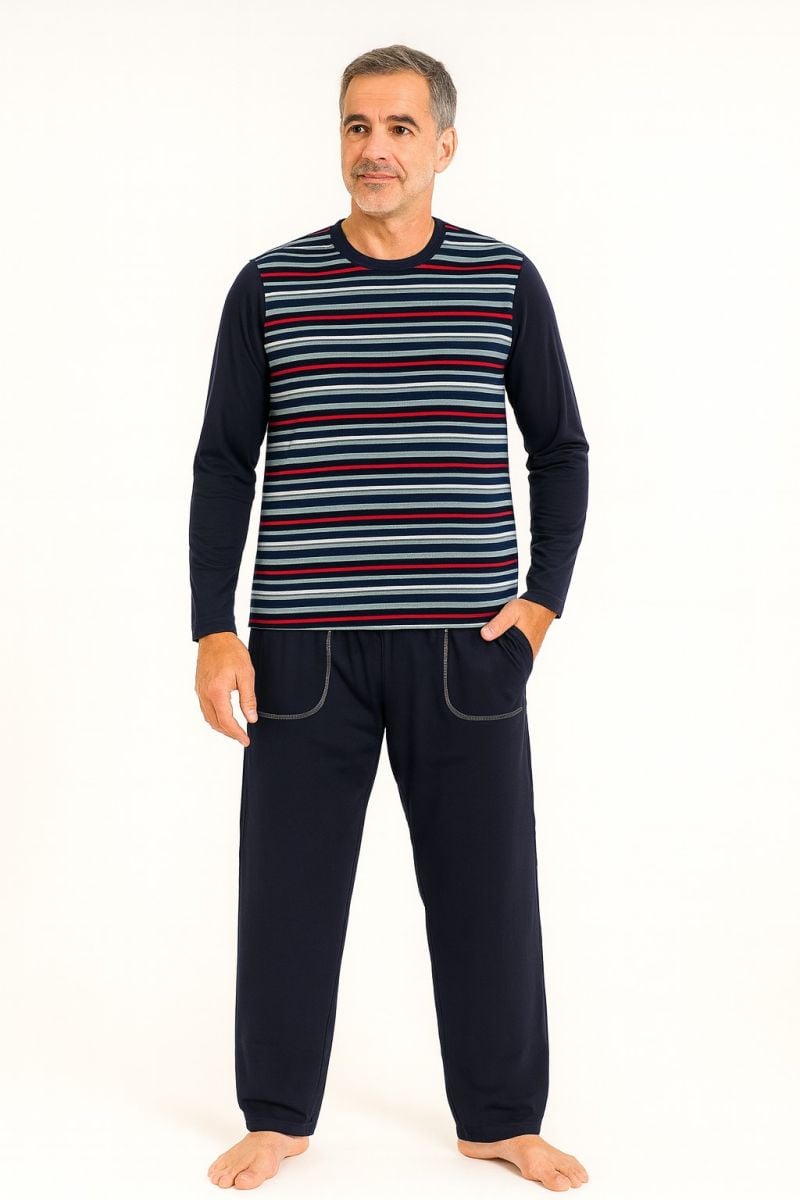 Pijamale Bărbați En-Gros – Fabricate în România, Bumbac 100%, Single Jersey Material Bumbac, tesatura tip Single Jersey( Glat). Serie : 4 marimi serie, ambalate individual. Seria Mica: 42(XXS),44(XS),46(S),48(M) Seria Mare: 50(L),52(XL),54(XXL)56(3XL) ✅ Produs fabricat în România ✅ Material: bumbac✅ Mânecă lungă, pantaloni lungi, buzunare✅ Confort, calitate și stil clasic Acest set de pijamale pentru bărbați este confecționat din bumbac moale și respirabil, ideal pentru nopțile liniștite și relaxarea de acasă. Materialul natural permite pielii să respire, oferind o senzație plăcută pe tot parcursul nopții.
