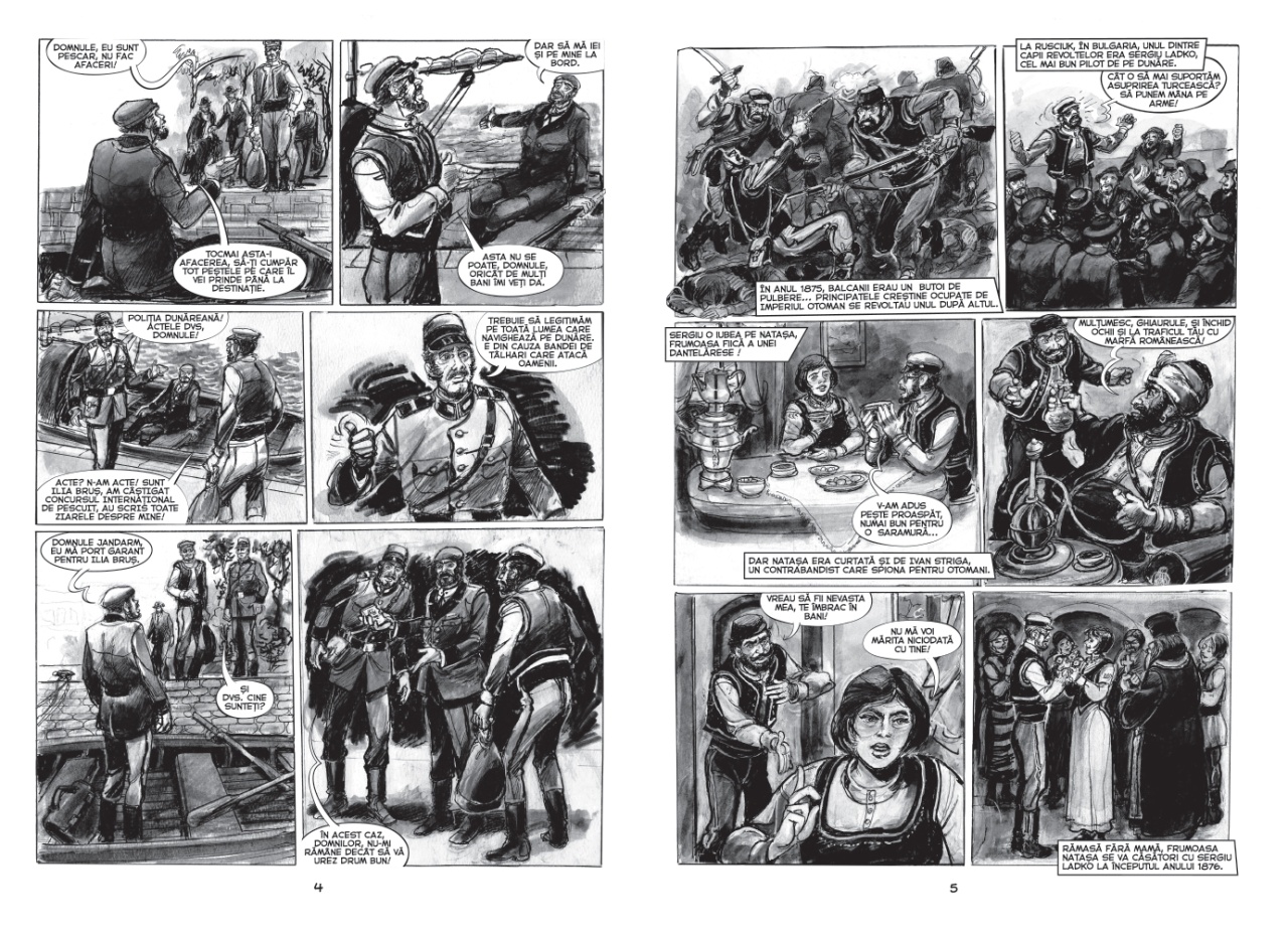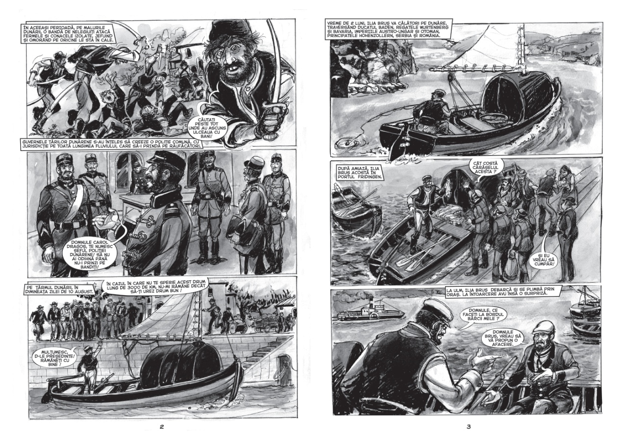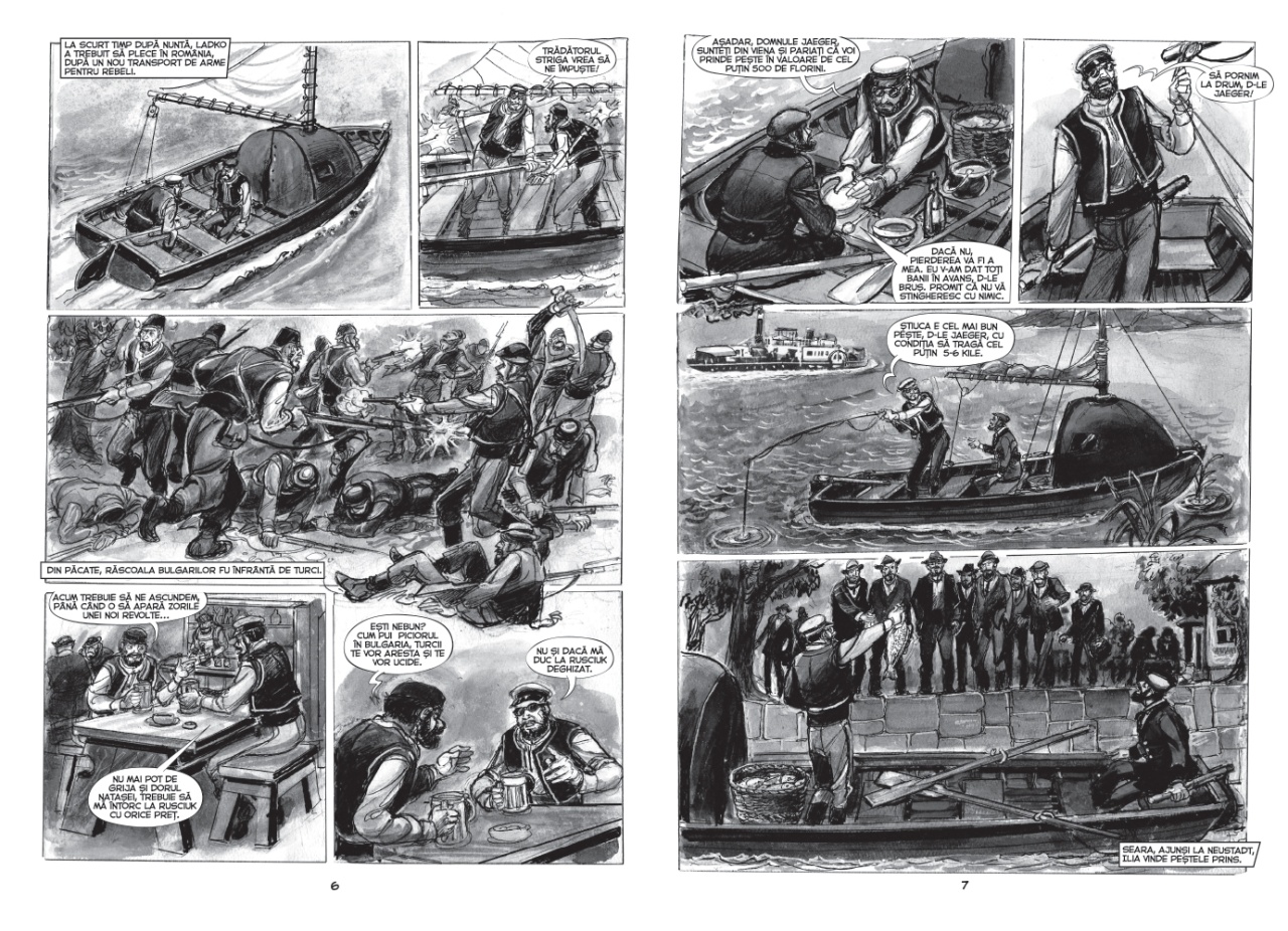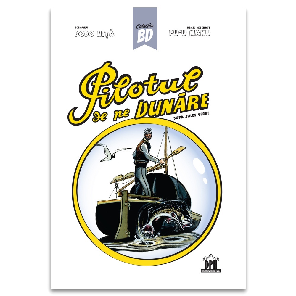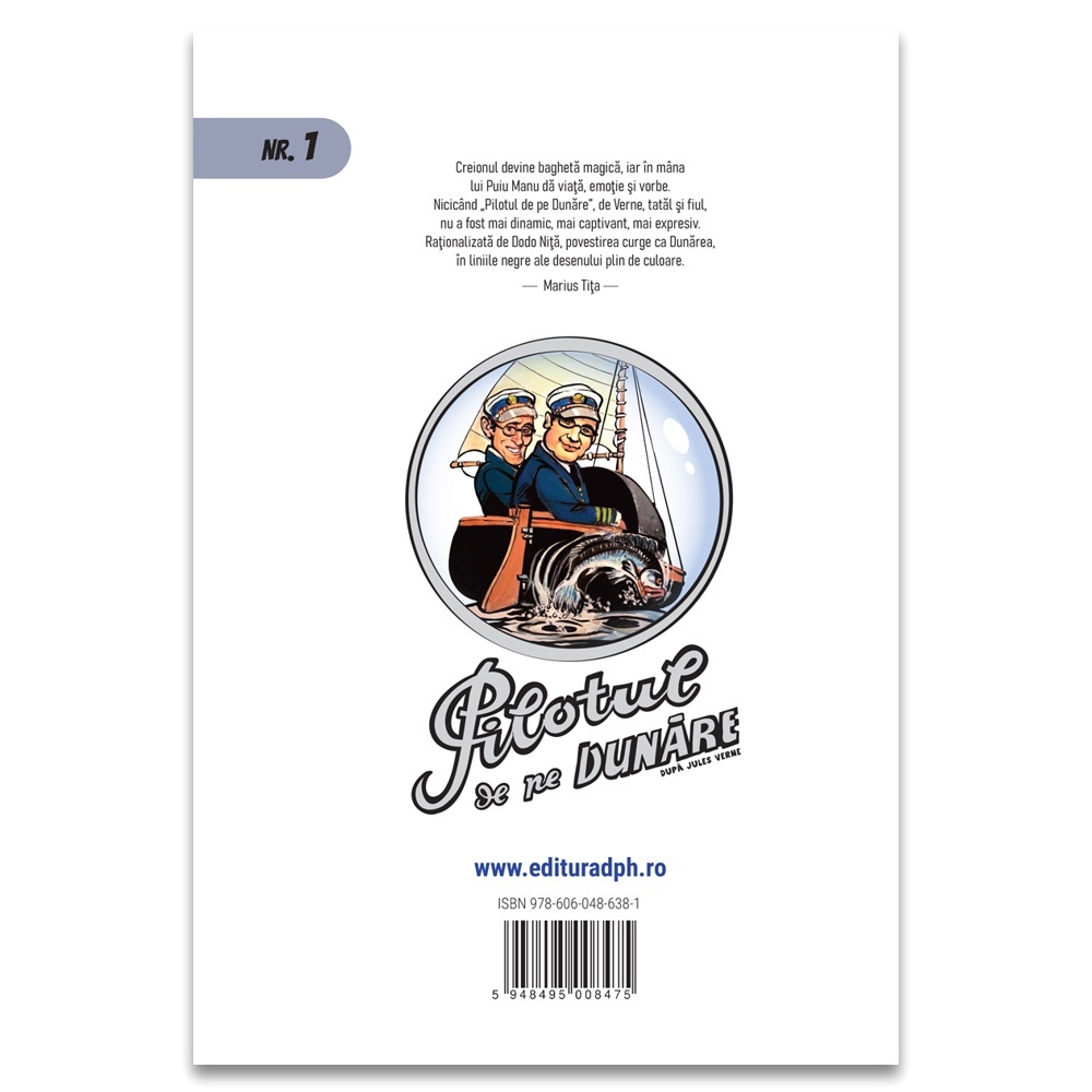 Creionul devine baghetă magică, iar în mâna lui Puiu Manu dă viață, emoție și vorbe. Nicicând “Pilotul de pe Dunăre”, de Verne, tatăl și fiul, nu a fost mai dinamic, mai captivant, mai expresiv. Raționalizată de Dodo Niță, povestirea curge ca Dunărea, în liniile negre ale desenului plin de culoare. Dacă evenimentele din roman nu se prea pretează la zâmbete, Puiu Manu găsește ocazia, în această adaptare în bandă desenată optimistă și veselă, să arunce câte o rază de soare printre norii intrigii, folosindu-se de expresiile faciale și de limbajul corporal ale personajelor. E și ocazia să ne ofere priveliști pitorești de pe malurile Dunării, de la Sigmaringen la Galați, și să reia o temă dragă lui – navigația. Sunt sigur că ați citit deja Toate pânzele sus! sau aventurile lui Dim Dunăreanu, dar sunt mai puțin sigur că știți un secret – Puiu Manu a făcut iahting de performanță, învățând tainele sportului pe… lacul Herăstrău. Are chiar și titlul de campion al României. Să publici un album de bandă desenată la 95 de ani e cu siguranță o performanță unică în lume, dar Pilotul de pe Dunăre nu e doar o curiozitate editorială – e o bandă desenată antrenantă, plină de acțiune, care se citește cu sufletul la gură. E și meritul lui Dodo Niță, care rezumă firesc un roman de aproape 350 de pagini în 37 de planșe BD, adăugându-și astfel și titlul de scenarist BD unui CV deja plin (pe lângă mereu reînnoita Istorie a Benzii Desenate Românești, a publicat volume de povestiri, articole, interviuri și monografii despre Livia Rusz, Sandu Florea, Nicu Russu, Burschi și… Puiu Manu). Caracteristici: Pagini: 48 Mărimi: 21*29,7 Autori: Puiu Manu Copertă: Cartonată Grupa de vârstă: 7 ani +