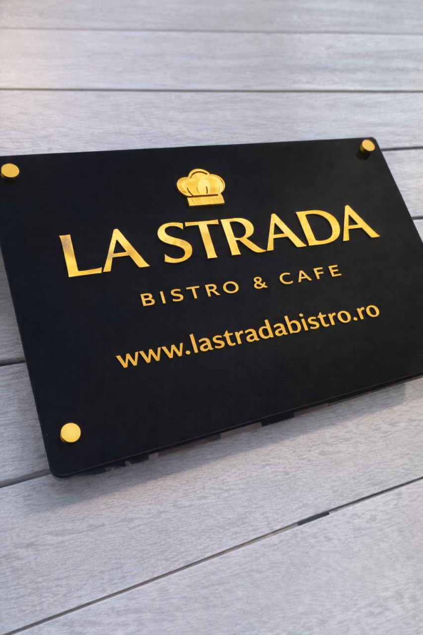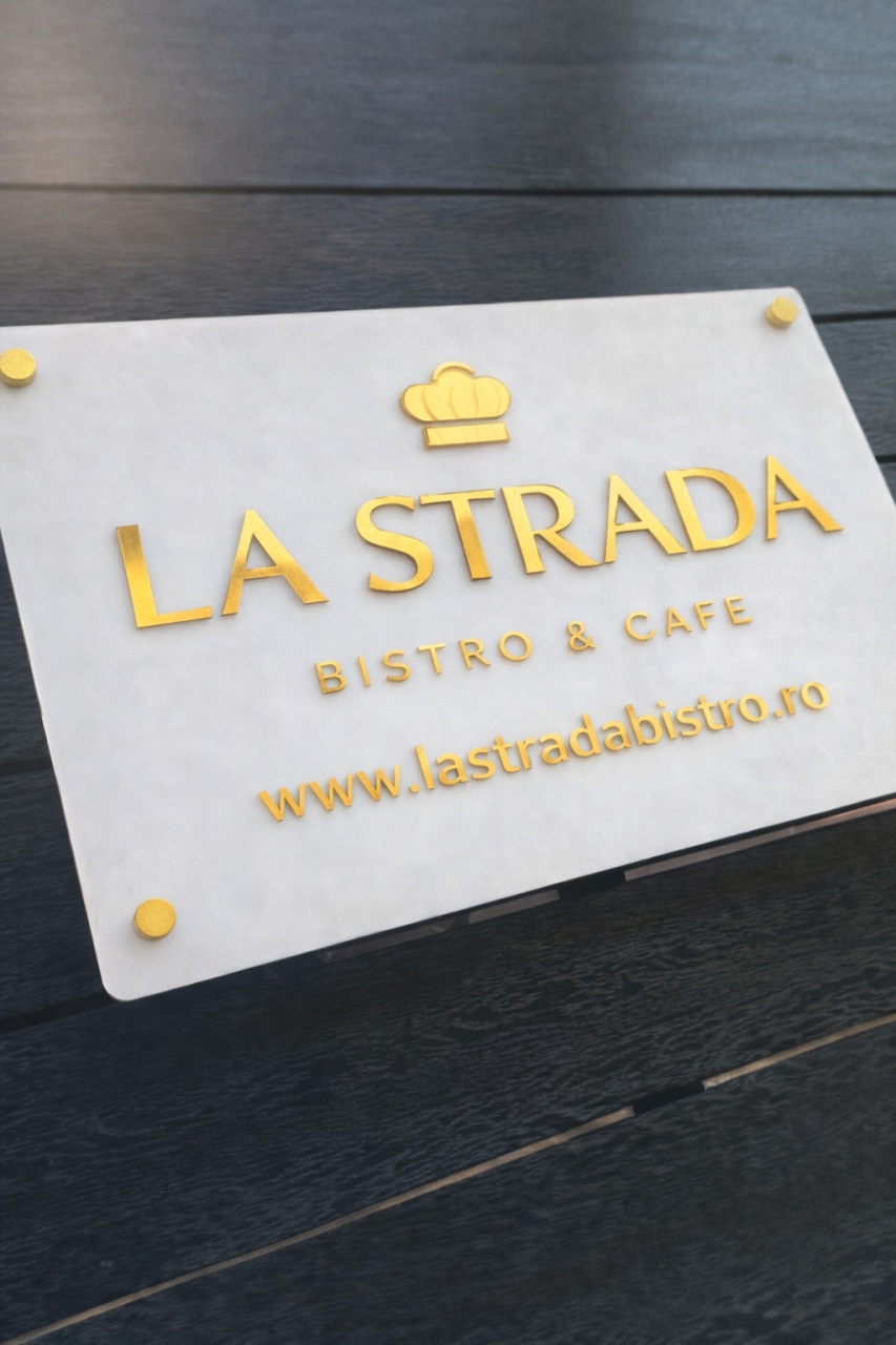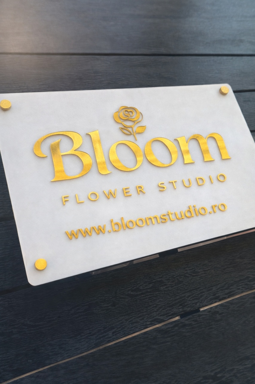 Evidențiază-ți afacerea cu o plăcuță firmă elegantă din plexiglas , realizată din materiale premium și finisaje de înaltă calitate. Acest tip de semnalistică este ideal pentru sedii de firmă, magazine, saloane de înfrumusețare, restaurante, cafenele, clinici sau birouri care doresc un aspect modern și profesionist. Plăcuța este realizată din plexiglas (acril) alb satinat , iar textul și logo-ul sunt realizate din litere 3D aurii , cu efect metalic elegant. Montajul se face cu distanțiere metalice aurii , oferind un efect flotant deosebit pe perete. ? Design modern și premium ? Rezistență ridicată la exterior ? Aspect profesional, ușor de remarcat Fiecare plăcuță este personalizată complet , în funcție de identitatea vizuală a afacerii tale. Caracteristici principale Material placă: Plexiglas / acril de calitate superioară Culoare placă: Alb satinat Litere: 3D – plexiglas auriu (efect metalic) Fixare: Distanțiere metalice aurii Utilizare: Interior / Exterior Rezistență la: UV, umiditate, variații de temperatură Personalizare: nume firmă, logo, slogan, website Dimensiuni & personalizare Dimensiuni standard sau la comandă Fonturi și layout la alegere Posibilitate includere: logo website descriere activitate