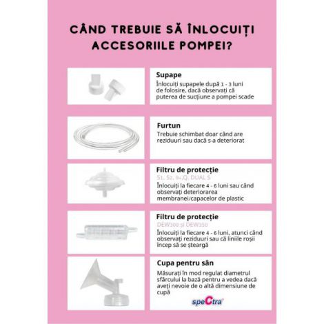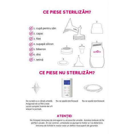 Laptele matern este cel mai bun pentru a asigura bebelusului o crestere si o dezvoltare fizica si psihica armonioasa. Legatura dintre mama si bebelus se consolideaza in timp, si cel mai important pas il reprezinta alaptarea. Totusi, sunt cazuri in care alaptarea este ingreunata sau deficitara, din diverse motive. Pentru a veni in intampinarea mamelor care au probleme in alaptare, pompele de san Spectra au functionalitati si caracteristici inovatoare pentru a acoperi o arie cat mai larga de situatii. Cum poate ajuta pompa de san Spectra mamele care alapteaza? stocarea laptelui pentru momentele in care mama nu este acasa cu bebelusulcresterea productiei de laptehranirea cu lapte matern a bebelusilor cu probleme de atasare la sanextragerea laptelui in exces pentru golirea sanilorcontinuarea alaptarii dupa intoarcerea mamei la locul de muncahranirea cu lapte matern a bebelusilor nascuti prematuripompele de san Spectra vin in ajutorul mamelor care alapteaza cu o gama variata de pompe electrice duble, care le ajuta sa extraga mai multe lapte intr-un timp cat mai scurtfie ca este vorba despre pompe pentru uz personal sau pentru maternitati, pe primul loc sunt confortul mamei si igiena laptelui extras Caracteristici Spectra 9+: este un cel mai usor model de pompa de san, fiind ideal pentru mamele care calatoresc sau care se intorc la locul de muncaare un acumulator inclus care permite o autonomie de 2 ore (incarcator din Lithium-Ion)este un model foarte usor (290 g)datorita dimensiunilor reduse 122 x 72 x 47 mm poate incapea usor in orice posetadesignul este foarte atractiv, astfel incat mamele care se intorc la birou il pot vedea ca pe un mic gadgeteste un model de pompa electrica, dubla, care poate fi folosita fie pentru pompare simultana sau doar la unul din sanieste ideala pentru utilizare frecventa sau ocazionalapoate fi folosita pentru extragerea si stocarea unei rezerve de lapte pentru momentele in care mama nu poate fi langa bebelusputernica si totusi delicata – 10 niveluri de reglare a vacuumului pana la 300 mmHG ( ±50mmHg) in functie de preferintele fiecarei mame, astfel experienta extragerii laptelui matern devine placuta si confortabila pentru fiecare mama2 moduri de functionare: stimulare a lactatiei (masaj) si extragerefunctia de stimulare a lactatiei (masaj) folosita inaintea fiecarei extrageri are rolul de a simula suptul bebelusului, declansand secretia de lapte - are 5 niveluri de masare functia de extragere permite o colectare rapida si fara durere, a laptelui matern, oferind 10 niveluri de pomparetimerul indica timpul de pomparese opreste automat dupa 30 de minute de utilizareecranul cu LCD permite vizualizarea simultana a vitezei si a ciclului de pompare, modalitatea pe care este folositadotata cu functia Memorie - in momentul in care pompa este repornita, aceasta va functiona conform ultimei setari a nivelului intensitatii recoltarii laptelui maternsilentioasa – poate fi folosita in aceeasi camera in care doarme bebelusul (sub 60 db)usor de asamblat si de sterilizattoate componentele care intra in contact cu laptele matern sunt fara continut de Bisfenol A (BPA free)recipientele de colectare a laptelui pot fi folosite pentru hranirea bebelusului, prin atasarea biberoanelor incluse in setdotata cu sistem anti-reflux care impiedica patrunderea laptelui in cele 2 furtunurialegerea corecta a marimii cupei de san este foarte importantapompele vin cu cupe marime standard 24mmputeti vedea in filmuletul de mai jos cum identificati marimea corecta Setul include: pompa principala Spectra 9plus2 cupe pentru sani - dimensiune cupa 24 mm2 biberoane2 tetine moi cu debit pentru nou nascuti2 furtunurialimentator pentru prize adaptor inclus2 sisteme igienice anti-reflux ce impiedica patrunderea laptelui in cele 2 furtunurinu contine BPA Specificatii tehnice: 10 niveluri de reglare a vaccumului - putere de extragere reglabila pana la 300 mmHg ( ±50mmHg)5 viteze de masaj - cu putere reglabila de 50~150mmHg ( ±50mmHg)Dimensiune: 112 x 72 x 47 mmTimer: se opreste automat dupa 30 minuteAutonomie acumulator: 2 h Timp de incarcare acumulator: 4 hGreutate: aprox 0,290 kgGarantie: 1 an Atentie! Acest produs este un dispozitiv medical si nu intra sub incidenta O.U.G. 34/2014 art 3, alin 3, lit b, privind returul produselor. Componentele care intra in contact cu laptele trebuiesc sterilizate inainte de fiecare utilizare. Laptele matern poate fi stocat 72 de ore in frigider si pana la 3 luni in congelator. Laptele matern nu se incalzeste la microunde si nu se fierbe. Folosirea componentelor la mai multe persoane poate duce la transmiterea diverselor boli. Contraindicat copiilor mai mici de 3 ani. Jucaria/produsul poate contine piese mici care se pot inghiti sau inhala existand pericolul de sufocare sau nu este potrivita copiilor mai mici de 3 ani. Nu lasati ambalajele jucariilor/produselor la indemana copiilor. Indepartati orice ambalaj al jucariei/produsului inainte de a da jucaria/produsul copilului. Va rugam sa supravegheati copilul in timp ce se joaca/foloseste acest produs. Pastrati instructiunile si etichetele pentru referinte viitoare. Pastrati jucaria/produsul departe de foc; feriti jucaria/produsul de temperaturi ridicate si umiditate.