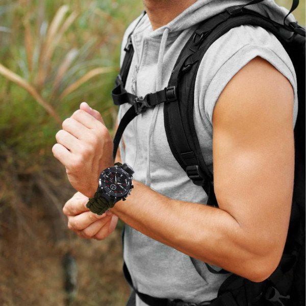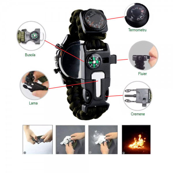 Aparat cu Radio FM / AM cu lanterna, proiector LED si lumina citit, senzor de miscare, Power Bank 4000mAh, cu incarcare solara, dinam si baterii, alarma SOS luminoasa si sonora, verde Dincolo de noroc, siguranța si rezultatele bune stau pe fundamentul unei bune organizări, asigurarea măsurilor de precauție si a unui plan de urgență. Aceste 3 aspecte sunt cele ce fac diferența in situațiile de criza, poate chiar si cele care ni se dovedesc a fi salvatoare. Aparatul multifuncțional îndeplinește 4 funcții majore: Radio , Lanterna, Power Bank si alarma SOS. Principala sa funcție, cea de radio, permite accesarea canalelor pe frecvente FM cat si AM, având posibilitatea setării frecventei manual, pentru obținerea rapida a rezultatelor dorite. Dispozitivul dispune si de o antena telescopica, ce ne permite captarea semnalului din unghiurile necesare unei bune redări. Aparatul este dotat cu o baterie Li-Ion cu o capacitate de 4000mAh, ce poate fi folosita cu brio pentru încărcarea de urgența a telefonului/tabletei sau altor dispozitive , cu ajutorul ieșirii sale USB. Dintre toate aceste funcționalități, am putea spune ca cea mai deosebita caracteristica a acestui dispozitiv este faptul ca poate fi încărcat- si folosit prin 4 tipuri de alimentări la energie, si anume: - Încărcare prin cablu la o sursa de curent direct - Încărcare cu ajutorul panoului solar incorporat - Încărcare manuala cu ajutorul dinamului - Acumulator Li-ion interschimbabil tip 18650 Dinamul oferă următoarele rezultate: 1 minut de generare = 6 minute de radio = 3-5 minute de încărcare telefon = 30 minute de iluminare(lanterna) Nu in ultimul rand, aparatul aare un mic display in care ne eeste afisaataa freecventa radio selectataa, niveelul bateriei apaaratului in 4 trepte (25% / 50% / 75% / 100%) precum si Specificații: Material: PC+ABS Dimensiune: 160 x 81 x 63mm Greutate: 380g Lampa 1 led: 1W Lampa proiector: 2W Luminozitate lanterna: 135Lm (max) Baterie interna: 4000mAh Banda disponibila: FM – 87 – 108 MHz / AM 520 ±1710KHz / WB 162.400 ±162.550MHz Consum maxim: 10W Output: 5V / 1A Timp de inncarcare : USB 5-6h Protectie uimditate: IPX3 Timp de functionnare (cu bateria 100% plina) : Lanterna nivel 1 >16h / Lanternă nivel 3 >10h / Lampaa de veghe >20h Ceas supravietuire militar multifunctional 6 in 1 , paracord 3 metri, cremene foc, busola, fluier, termometru, lama, negru Dincolo de noroc, siguranța si rezultatele bune stau pe fundamentul unei bune organizări, asigurarea măsurilor de precauție si a unui plan de urgență. Aceste 3 aspecte sunt cele ce fac diferența in situațiile de criza, poate chiar si cele care ni se dovedesc a fi salvatoare. Stim ca iti place sa te simti in siguranta cand pleci in calatorii si vrei sa ai totul la indemana. Ei bine, ceasul multifunctional 6 in 1 iti ofera toate functiile sale, literalmente la indemana! Ceasul are un design robust, placut estetic, fiind totodata rezistent la apa si avand in dotare 6 functii utile, precum: - Funie - Cremene - Busola - Fluier - Termometru - Lama Bratara ceasului este confectionata din funie paracord, recunoscuta pentru rezistenta de pana la 250kg si pentru nenumaratele posibilitati de utilizare in caz de urgenta: repararea cortului, adapost de urgenta, capcane, garou, pescuit etc. Desfacuta complet, funia are o lungime de 3 metri. In inchizatoarea bratarii se afla, de asemenea, un cremene, adica aprinzator de foc tip flint, care spre deosebire de bricheta sau chibrituri, continua sa functioneze si in conditii de umezeala, iar in partea opusa aprinzatorului se afla o lama de dimensiuni reduse, cu ajutorul careia se pot produce scanteile necesare aprinderii focului Busola incoporata este rezistenta la apa, fiind un ghid in parcurgerea oricarui traseu in siguranta Ceasul este dotat, de asemenea, cu un fluier puternic si clar, menit sa fie auzit de la kilometric distanta, reusind astfel sa capteze atentia si sa indrume ajutorul catre utilizator. Nu in ultimul rand, mai regasim un termometru ce mentine purtatorul informat in orice moment, fiind astfel capabil de a lua decizii salvatoaree, spre exemplu pentru a evita hipotermia. Specificații: Material: Paracord/ Plastic / Inox Dimensiuni: 130 x 72 x 60 mm Greutate: 140g Rezistent la apa: IP54 Culoare: Negru