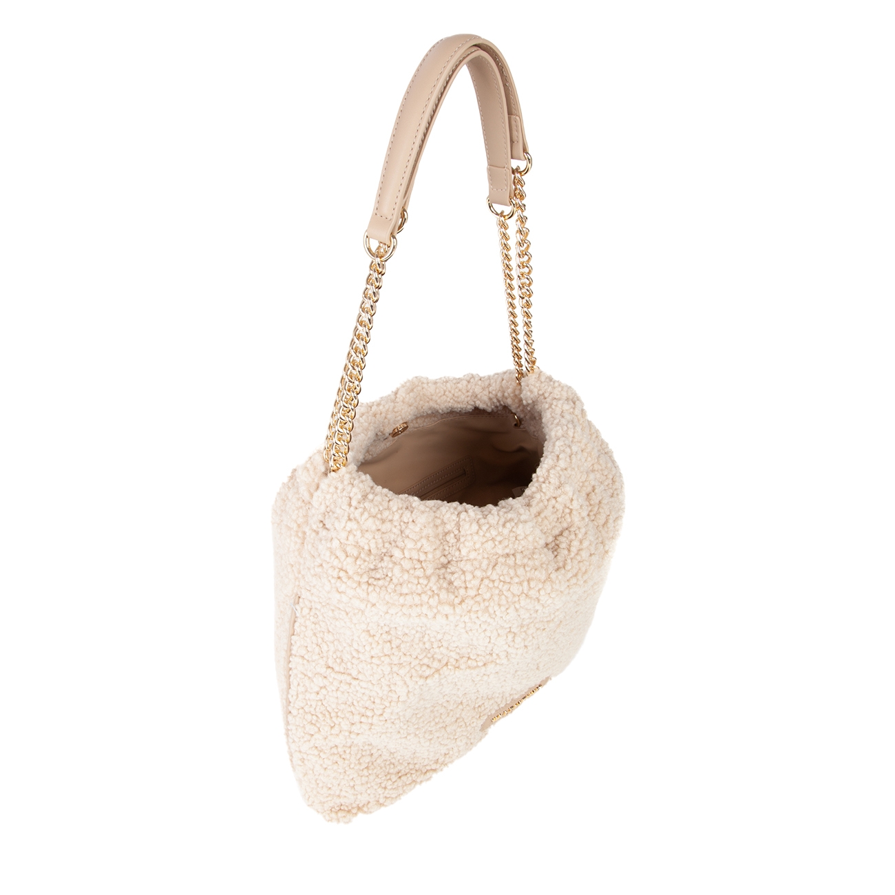 Geanta Mario Valentino Hobo Bag Qube aduce un plus de confort și stil sezonului rece prin textura sa pufoasă de tip shearling într-o nuanță caldă de crem. Modelul este prevăzut cu mânere lanț aurii cu inserții din piele ecologică și o baretă suplimentară reglabilă pentru purtare versatilă.