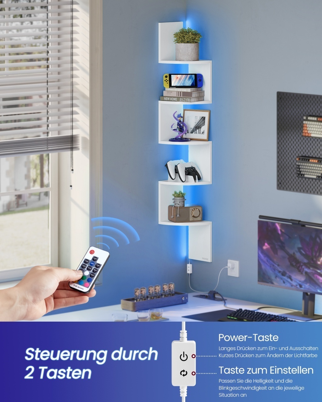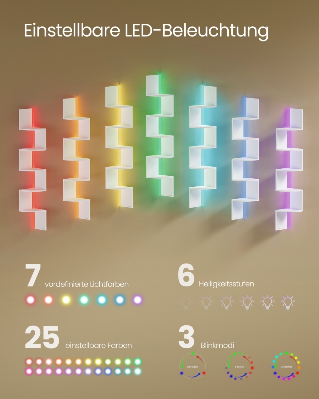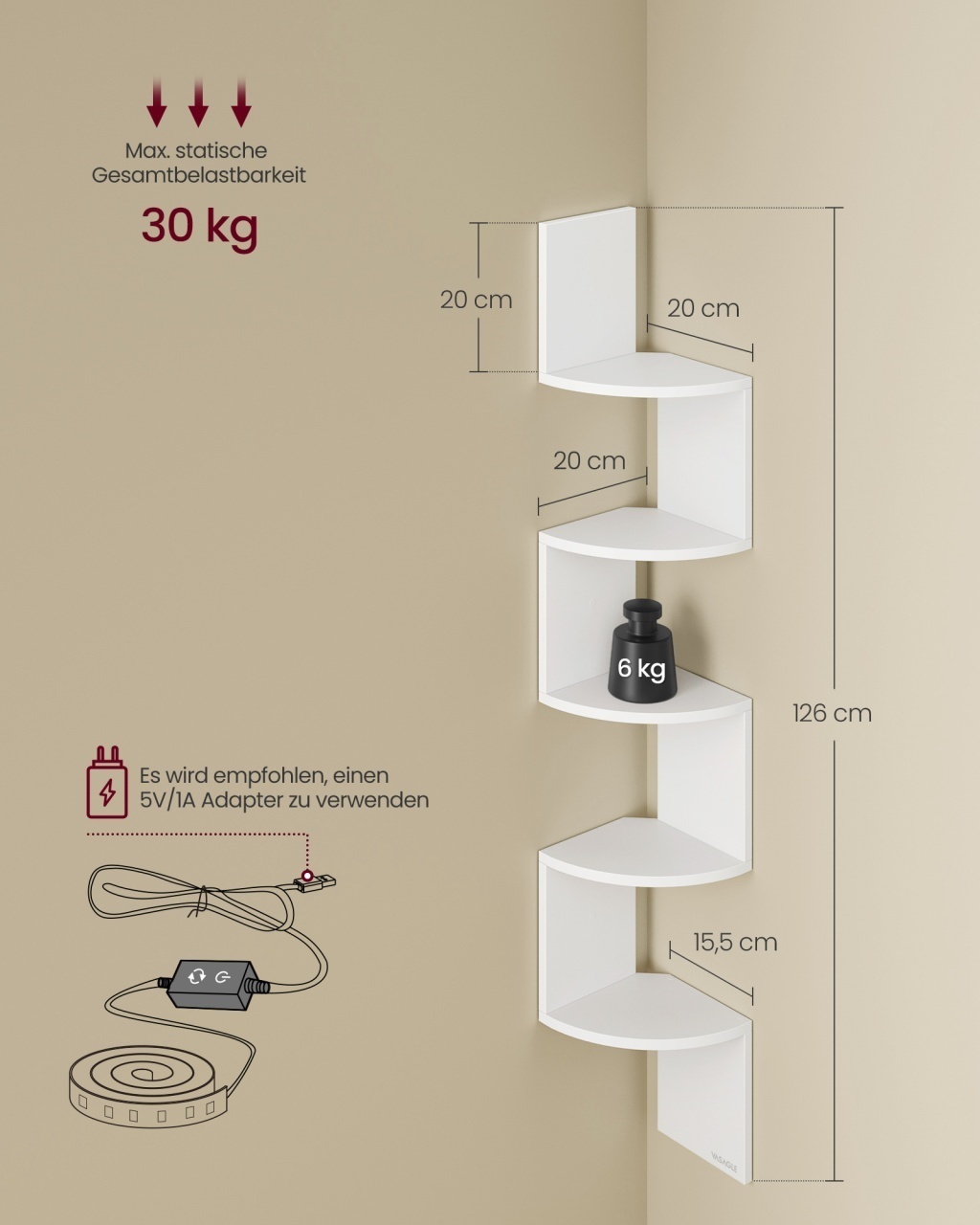 Raft de colț suspendat Arno, Alb — Maximizează colțurile cu iluminare RGB și design elegant Design și materiale de calitate Raftul Arno transformă un colț neobservat în punctul central al camerei: un profil în zigzag cu finisaj mat în Alb și o lumină integrată care creează ambianțe calde sau vibrant-elegante. Corpul este realizat din Lemn PAL , iar panourile de iluminare sunt gestionate prin componente electronice discrete; iluminarea este RGB (Roșu, Verde, Albastru) activată prin LED (diodă emițătoare de lumină), permițând să reglați culoarea, intensitatea și efectele pentru orice dispoziție. Funcționalitate și organizare Designul cu 5 niveluri în zigzag oferă spațiu pentru cărți, plante și obiecte decorative fără a aglomera încăperea, valorificând colțurile inutilizate. Fiecare poliță suportă până la 6 kg , iar capacitatea totală este de 30 kg , ideal pentru aranjamente ușoare sau colecții mici. Dimensiunile compacte de 20 x 20 x 126 cm fac raftul potrivit pentru Living și Dormitor , aducând o notă caldă, relaxantă și ordonată spațiului. Montaj și întreținere Asamblarea este facilă: părțile sunt etichetate și însoțite de Instrucțiuni clare , iar în pachet găsiți Accesorii de montaj pentru fixare. Controlul iluminării se face rapid prin telecomandă sau buton, oferind 7 culori, niveluri de luminozitate și moduri de flash pentru atmosferă. Pentru întreținere, curățați suprafețele cu o lavată moale pentru a păstra finisajul mat și aspectul imaculat. Comandă acum și transformă-ți spațiul! Adaugă un punct de lumină și ordine în casa ta: alege raftul de colț Arno pentru ambianțe personalizate, economisire de spațiu și un design rafinat care se face remarcat. Detalii tehnice complete Dimensiuni și greutate Dimensiuni produs: 20 x 20 x 126 cm Greutate produs: 3.2 kg Capacitate maximă de susținere: 30 kg Materiale și caracteristici Material corp: Lemn PAL Material finisaj/tapițerie: Finisaj mat Culoare: Alb Număr pachete: 1 Montaj și pachet Stare asamblare: Neasamblat Conținut pachet: 1 x Raft de colț, Accesorii de montaj, Instrucțiuni Stil și origine Stil: Modern Destinație recomandată: Living, Dormitor, Baie, Birou