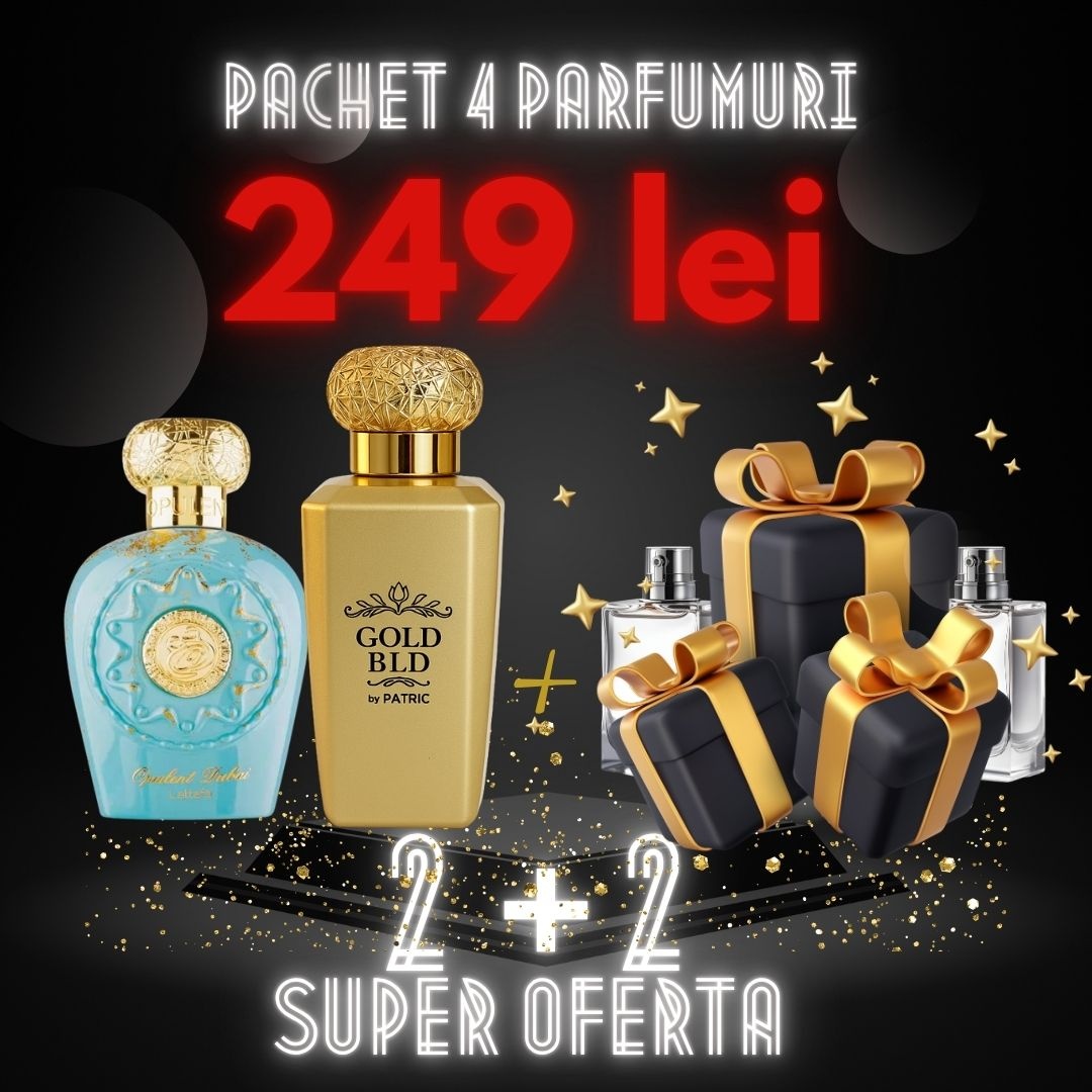 ✨ Pachet Super Promo 3 + 3 = 6 ✨ Cumperi 3 Primesti 6 Primești TREI PARFUMURI de 100 ml Cadou Surpriză la achiziționarea acestui pachet exclusiv! ? + 3 Parfumuri Surpriză de 100ml CADOU ? La acest pachet premium, primești trei parfumuri orientale de colecție, oferite CADOU pentru a-ți completa colecția de arome!