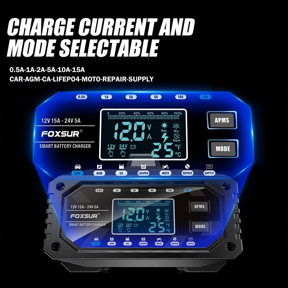 Incarcator automat baterii auto FOXSUR 12V 15A / 24V 5A – cu afisaj LCD, 10 trepte de incarcare si mod reparare Incarcatorul FOXSUR 12V/24V este un incarcator automat inteligent , conceput pentru a incarca rapid si in siguranta majoritatea bateriilor auto si moto de 12V si 24V. Ideal pentru baterii plumb-acid, AGM, GEL, EFB, Ca si LiFePO4 , acest model dispune de un microprocesor cu 10 trepte de incarcare , afisaj LCD de mari dimensiuni si functie de reparare a bateriilor uzate sau sulfatate . ⭐ Caracteristici principale: Tensiune de iesire: 12V 15A / 24V 5A (selectabil automat) Curent reglabil: 0.5A, 1A, 2A, 5A, 10A, 15A Afisaj digital LCD – monitorizare in timp real a tensiunii, curentului, temperaturii si starii bateriei Moduri de lucru multiple: CAR, AGM, CA, LiFePO4, MOTO, REPAIR, SUPPLY Recunoaste automat tipul bateriei si starea de incarcare Functie REPAIR: reparare prin impulsuri pentru baterii vechi sau descarcate Functie SUPPLY: mod de alimentare continua 12V (chiar si de la 0V) Ventilator de racire activ inteligent Protectii inteligente: supratensiune, supracurent, supraincalzire, polaritate inversa, scurtcircuit, incendiu ? 10 trepte automate de incarcare: Diagnosticare Desulfatare Pre-incarcare Incarcare lenta Incarcare rapida (bulk) Incarcare curent constant Incarcare 1/2 curent Incarcare absorbtie Incarcare de intretinere (float) Restartare automata dupa descarcare ? Utilizare recomandata: ✔️ Autoturisme, SUV, ATV, motociclete, scutere, barci, casute mobile ✔️ Ideal pentru service-uri auto, garaje personale si utilizatori casnici ✔️ Compatibil cu baterii de la 4Ah pana la 250Ah ⚙️ Specificatii tehnice: Tensiune de intrare: 100-240V AC, 50-60Hz Putere maxima consumata: aprox. 300W Tip functionare: Complet automat, controlat prin microprocesor (CPU) Capacitate baterii: 4Ah – 250Ah Eficienta: ~85% Protectie termica: 55°C ± 5°C Greutate: 1005g Dimensiuni: 195 × 190 × 135 mm Certificari: CE, FCC, ROHS ✅ Continut pachet: Incarcator FOXSUR 12V/24V Cablu cu cleme (cleste pozitiv si negativ) Manual de utilizare ℹ️ Compatibilitati baterii: 12V: GEL, AGM, EFB, plumb-acid, CA, LiFePO4 24V: plumb-acid, AGM, GEL (in general pentru camioane, utilaje, barci) Functioneaza si cu baterii descarcate complet (de la 0V) Atentie: A nu se utiliza la baterii litiu-ion de tip laptop/telefon. Nu conectati incorect bornele (clemele sunt protejate, dar poate aparea mesaj de eroare).
