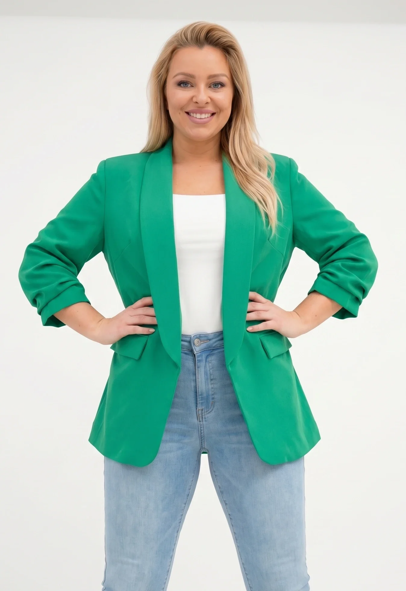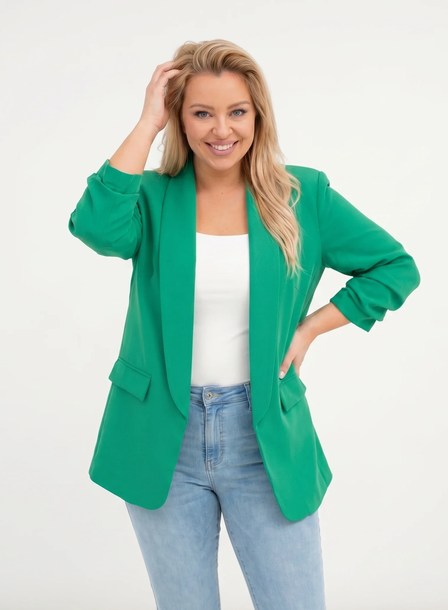Sacou elegant marime mare verde cu maneci drapate Fancy - stil casual și elegant Cu o croială lejeră, revere largi și mâneci drapate, acest model ofera un aspect modern și rafinat. Fără închidere în față, sacoul este ușor de purtat și versatil, asortându